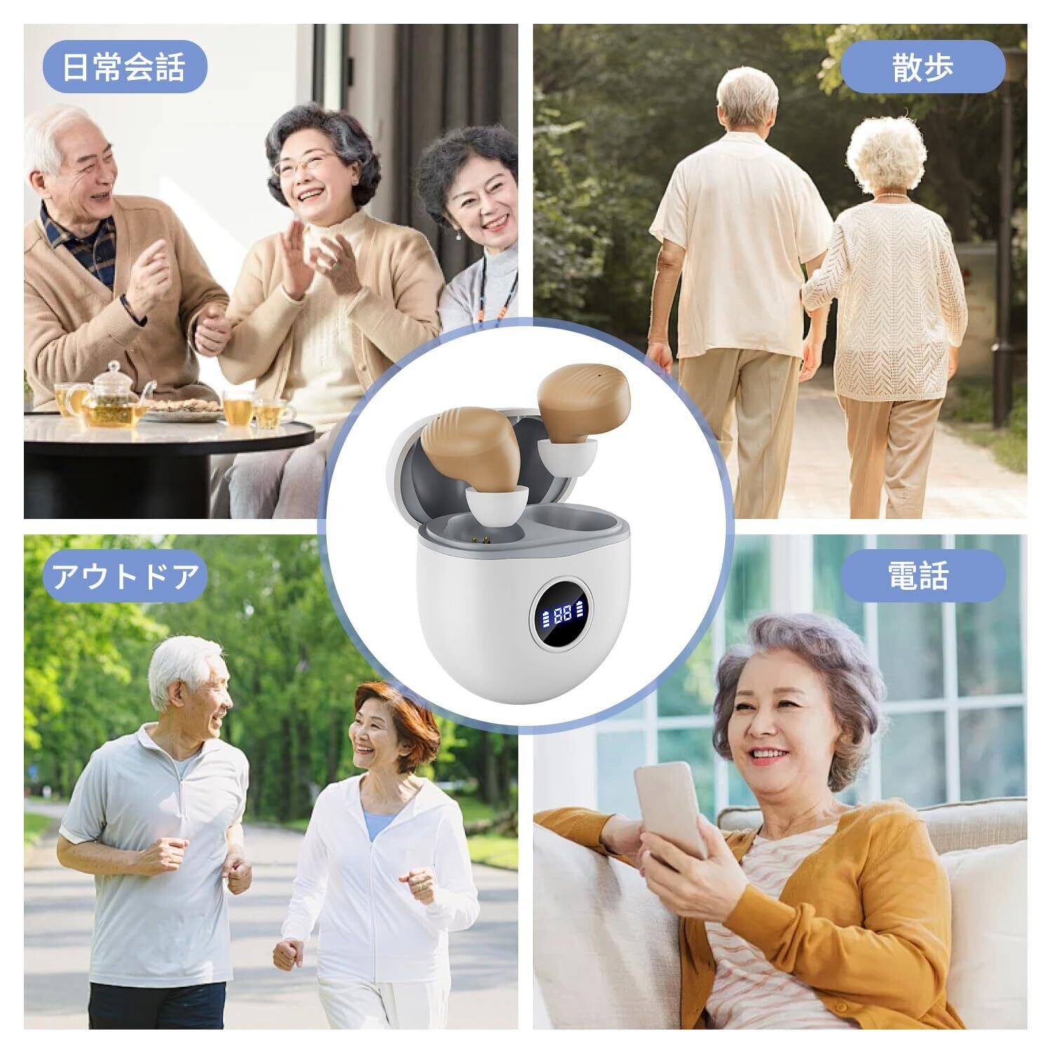 【4段階音量調整・自動ノイズ抑制機能搭載】1-4段階の音量を細やかい調整できます。125dBのハイパワーで、軽度から中程度の聴力障害の方を対象に設計されています。自然な聞こえやすさを追求。周囲の音を常に解析し、声音に干渉するノイズを60%減らしたり、突然鳴った大きな環境音を小さくして、耳への負担を和らげるノイズ抑制機能を搭載しています。集音器本体の中部にタッチするたびに音量レベル1~4の順に繰り返されます。(レベルごとに回数が変わるビープ音付きので、高齢者にもすぐ分かる)
