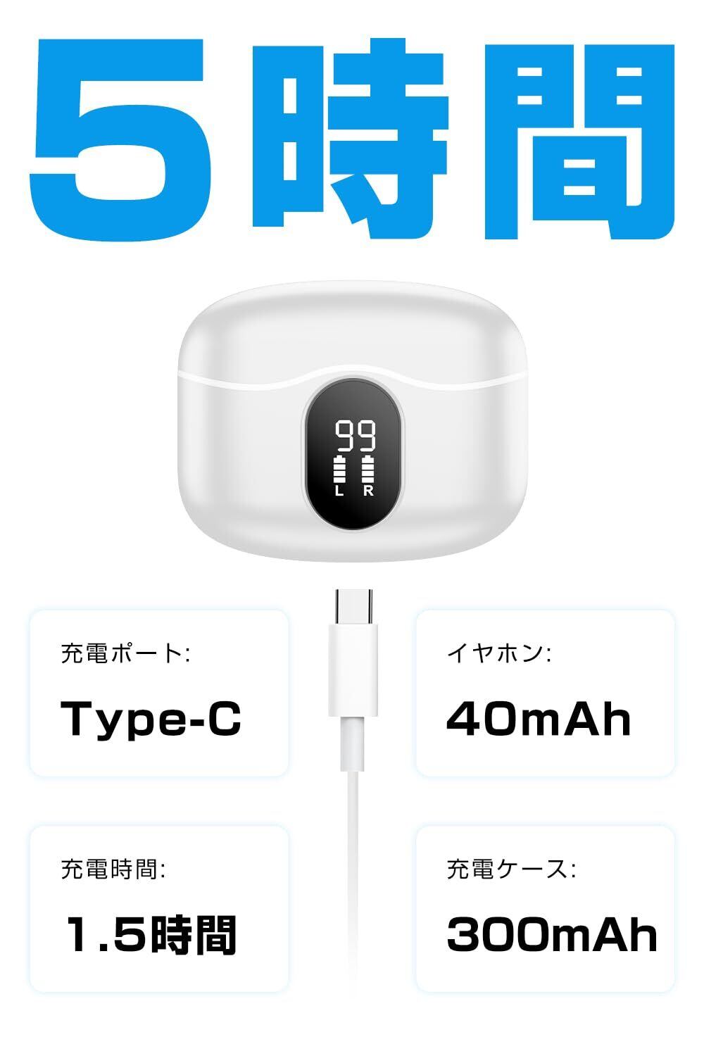 【超長時間使用&電力残量表示】当社のイヤホンは、集音器としての機能を備えた最先端機器です。フル充電で5時間以上連続使用が可能で、充電ケースには300mAhのバッテリーを内蔵し、これにより集音器を追加充電することで合計20時間連続使用が可能です。充電ケースはType-C充電ケーブルを使用し、わずか2時間でフル充電が完了します。さらに、充電ケースには便利な電力残量表示機能が搭載されています。明瞭なインジケーターランプにより、バッテリー残量を一目で確認できます。これにより、充電のタイミングを見逃すことなく、常に快適なオーディオ体験をお楽しみいただけます。