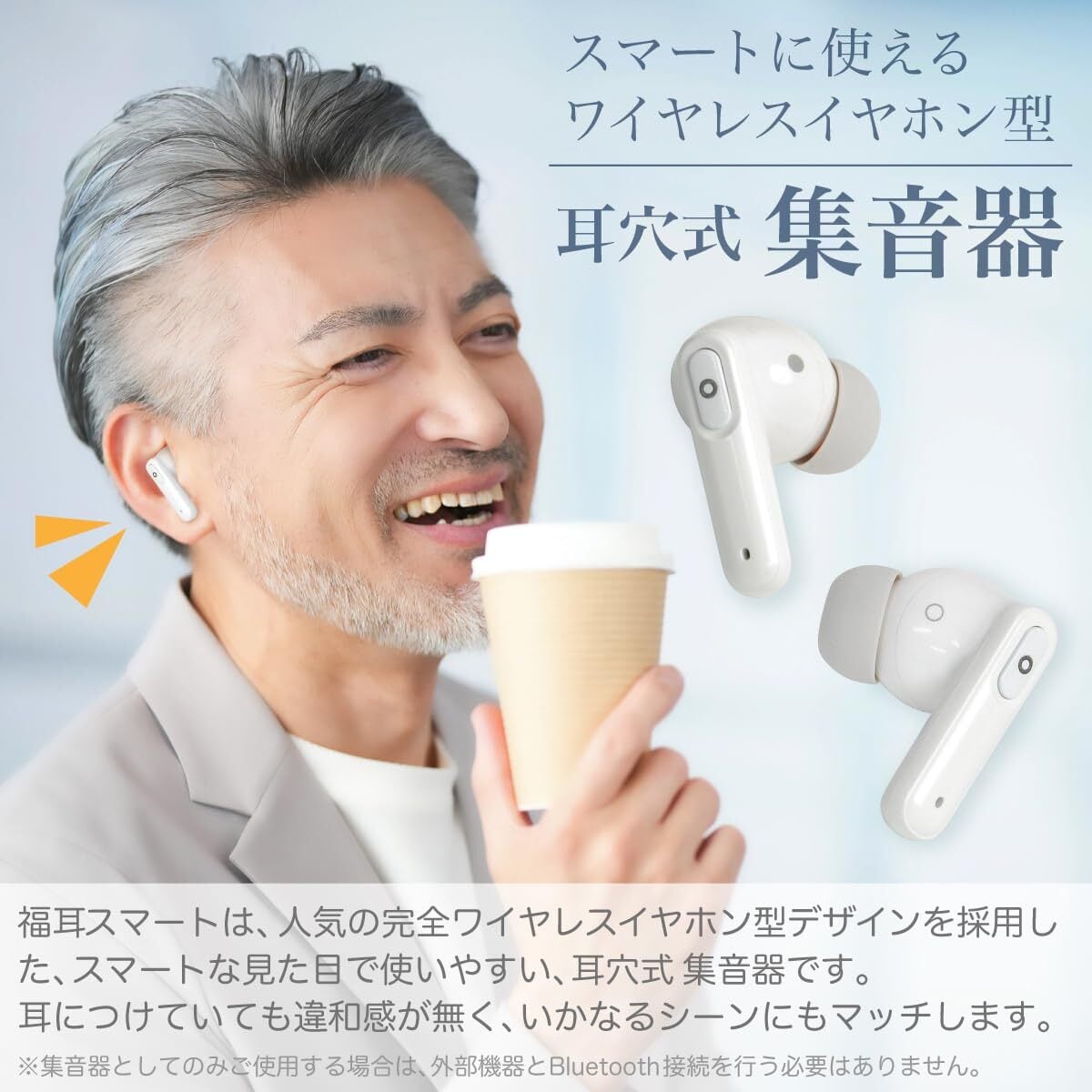 【スマートに使えるワイヤレスイヤホン型の耳穴式集音器】福耳スマートは、人気の完全ワイヤレスイヤホン型デザインを採用した、スマートな見た目で使いやすい、耳穴式 集音器です。耳につけていても違和感が無く、いかなるシーンにもマッチします。