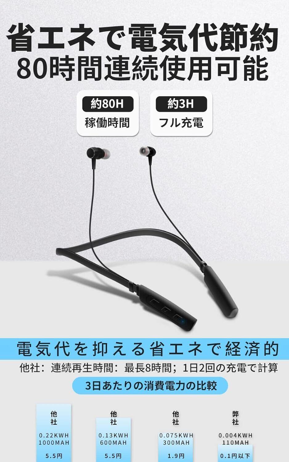 80時間の超長いバッテリで、一周間の使い放題です。どこでもいつでも聞こえます。
