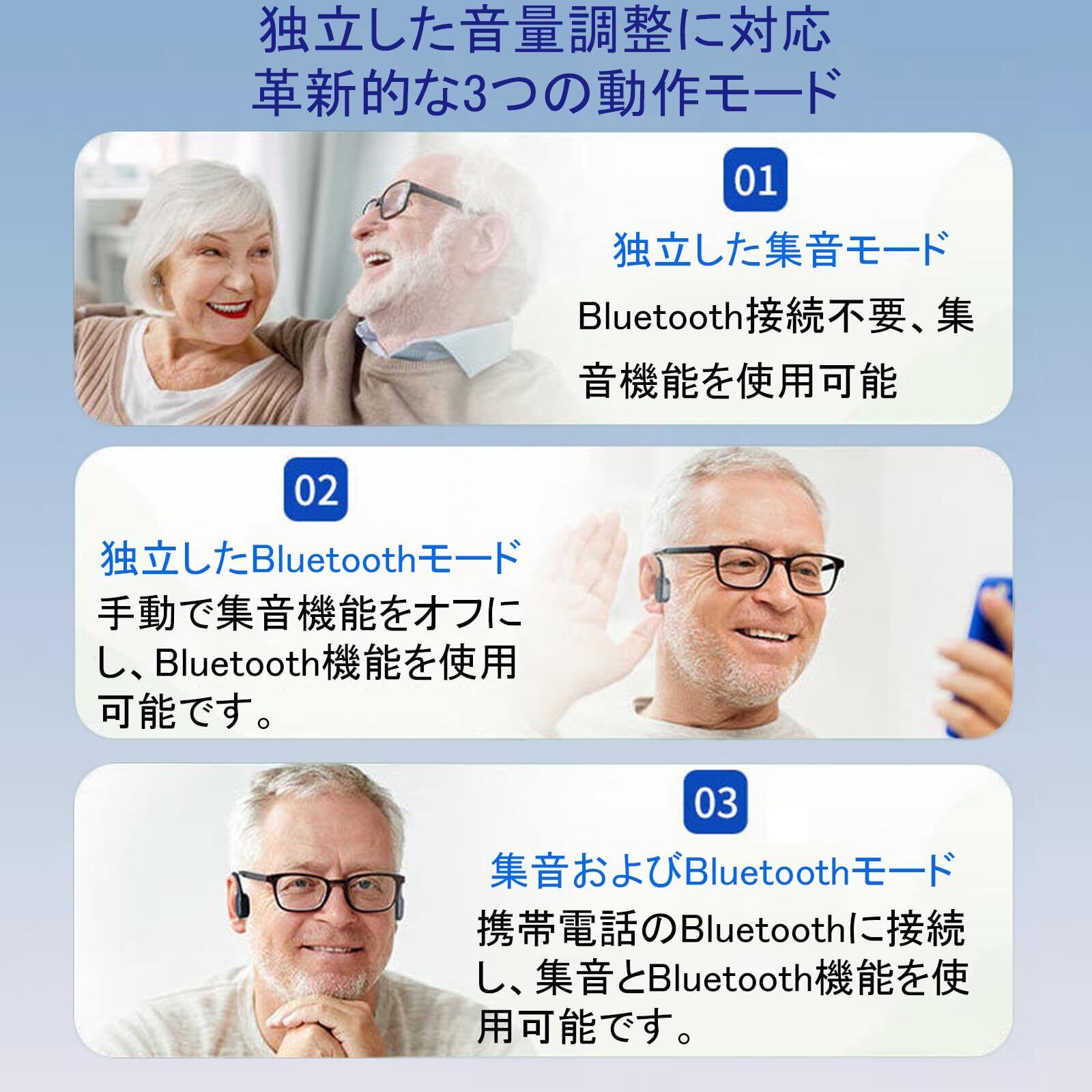 【独立した音量調整に対応・革新的な3つの動作モード】1.独立した集音モード:Bluetooth接続不要、集音機能を使用可能;2.独立したBluetoothモード:手動で集音機能をオフにし、Bluetooth機能を使用可能です;3.集音およびBluetoothモード:携帯電話のBluetoothに接続し、集音とBluetooth機能を使用可能です。着信時、集音モードは自働的にオフになります。通話が終了すると、集音モードが自動的にオンになります。最新のコアアルゴリズムを採用し、サウンドがより重層的になり、人の声の明瞭度が向上し、集音や通話の効果がされます。