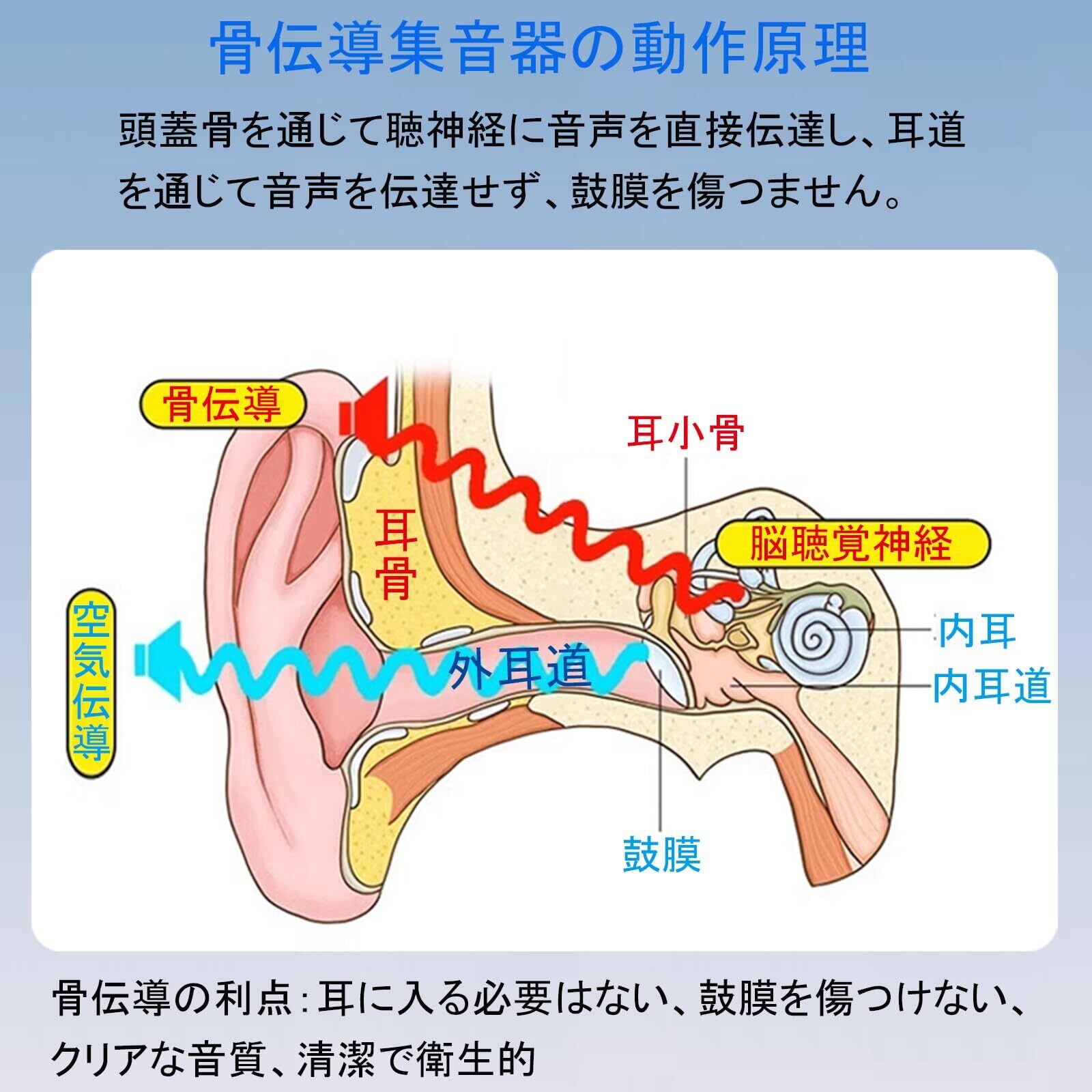 【骨伝導集音器・先進的な業界技術】先進的な業界技術で、骨伝導集音器でもあり、Bluetoothヘッドフォンでもある。16チャンネルのデジタルチップ、インテリジェントなノイズ低減機能により、クリアな音声を聴くことができます。頭蓋骨を通じて聴神経に音声を直接伝達し、耳道を通じて音声を伝達せず、鼓膜を傷つません。軽度、中等度、および重度の聴力障害のある成人に適しています。