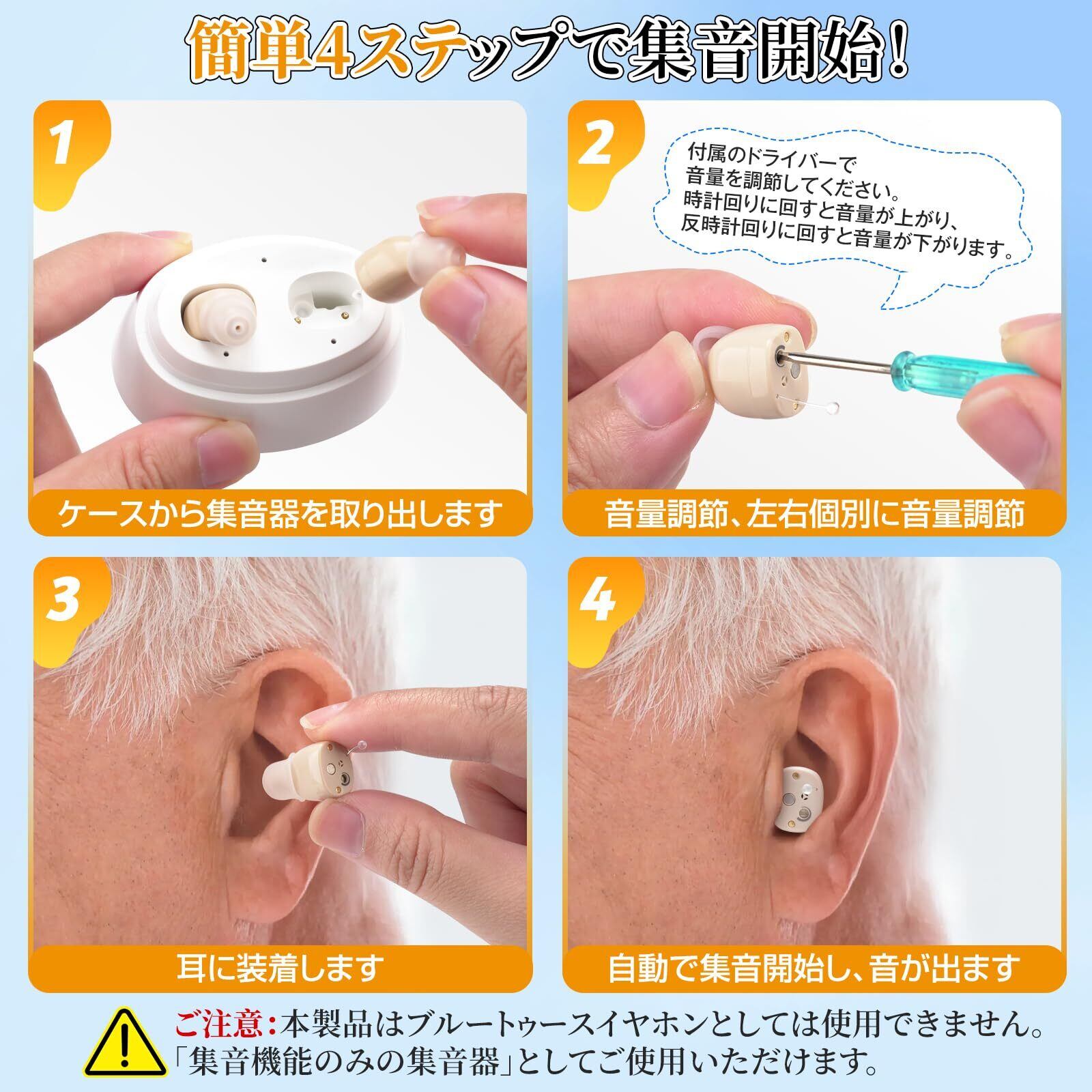 【無段階音量調整、高齢者にも優しいワンタッチ操作】この集音器は高齢者の方でも簡単に操作できるよう設計されています。左右個別に音量調節、付属のドライバーで音量を調節してください(レベルごとに回数が変わるビープ音付き)。時計回りに回すと音量が上がり、反時計回りに回すと音量が下がります。高性能チップ搭載でノイズを約60%低減しながら、音声を最大35倍まで増幅!テレビの大音量やご家族との会話など、聞き取りづらい悩みから解放され、生活の質を向上させます。【ご購入前のご確認をお願いします】集音器の特性上、人声を増幅する際に周囲の環境音(車の音/風音/生活音等)も同時に増幅してしまいます。静かな環境での使用を推奨します。※これはすべての集音器に共通する特徴です。