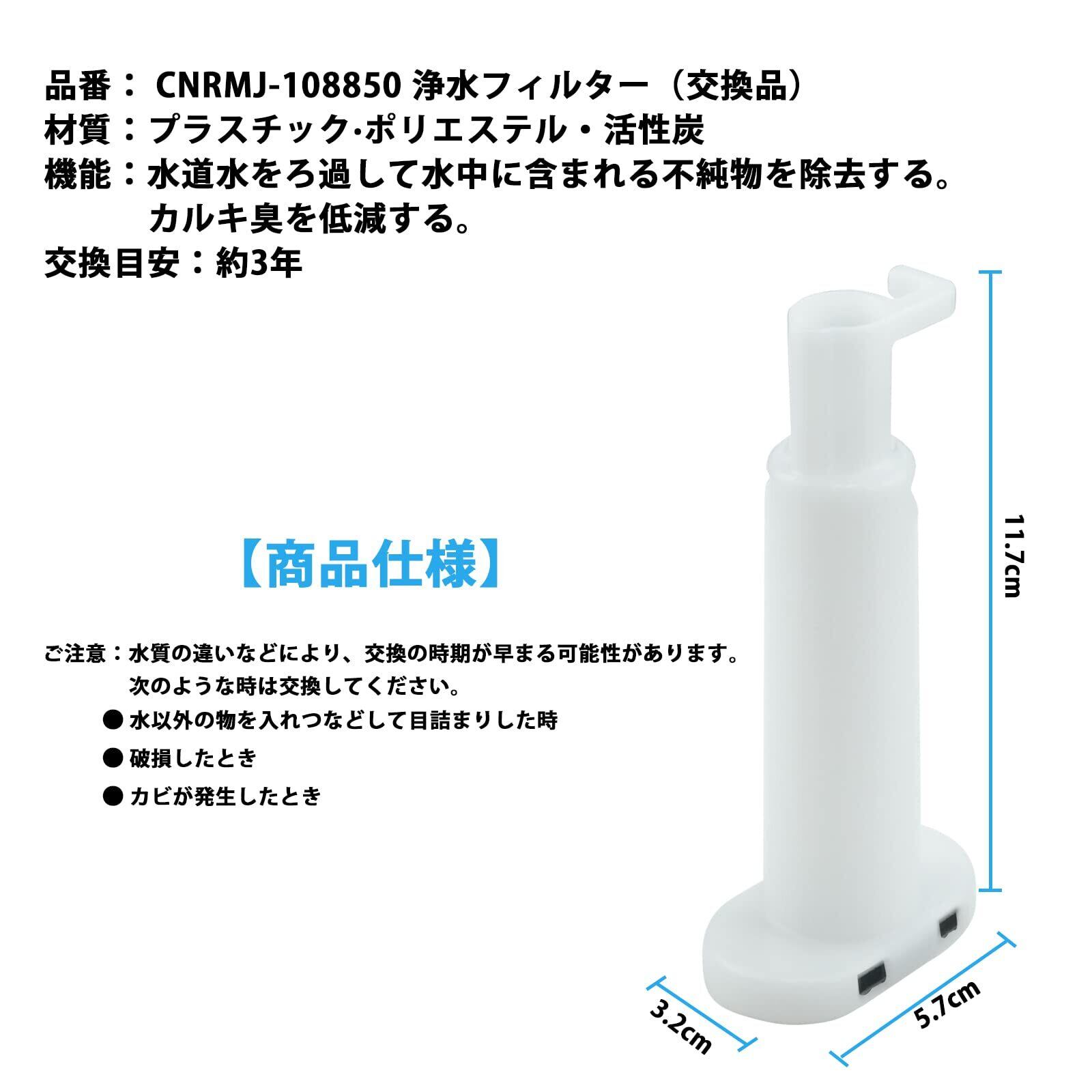 【商品情報】CNRMJ-108850 浄水フィルター(交換品) 材質:プラスチック·ポリエステル・活性炭 機能:水道水をろ過して水中に含まれる不純物を除去する。 サイズ:約奥行き3.2cm、幅5.7cm、高さ11.7cm