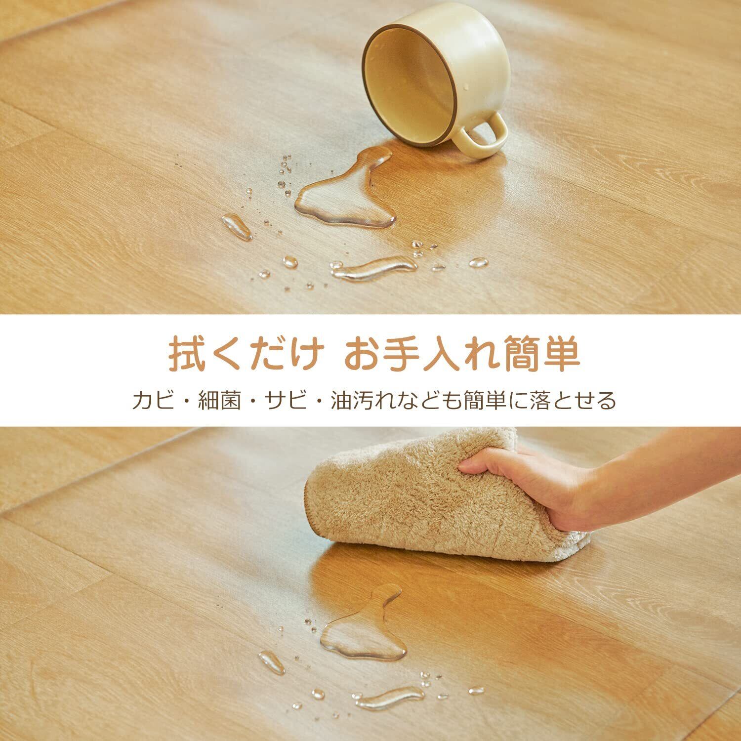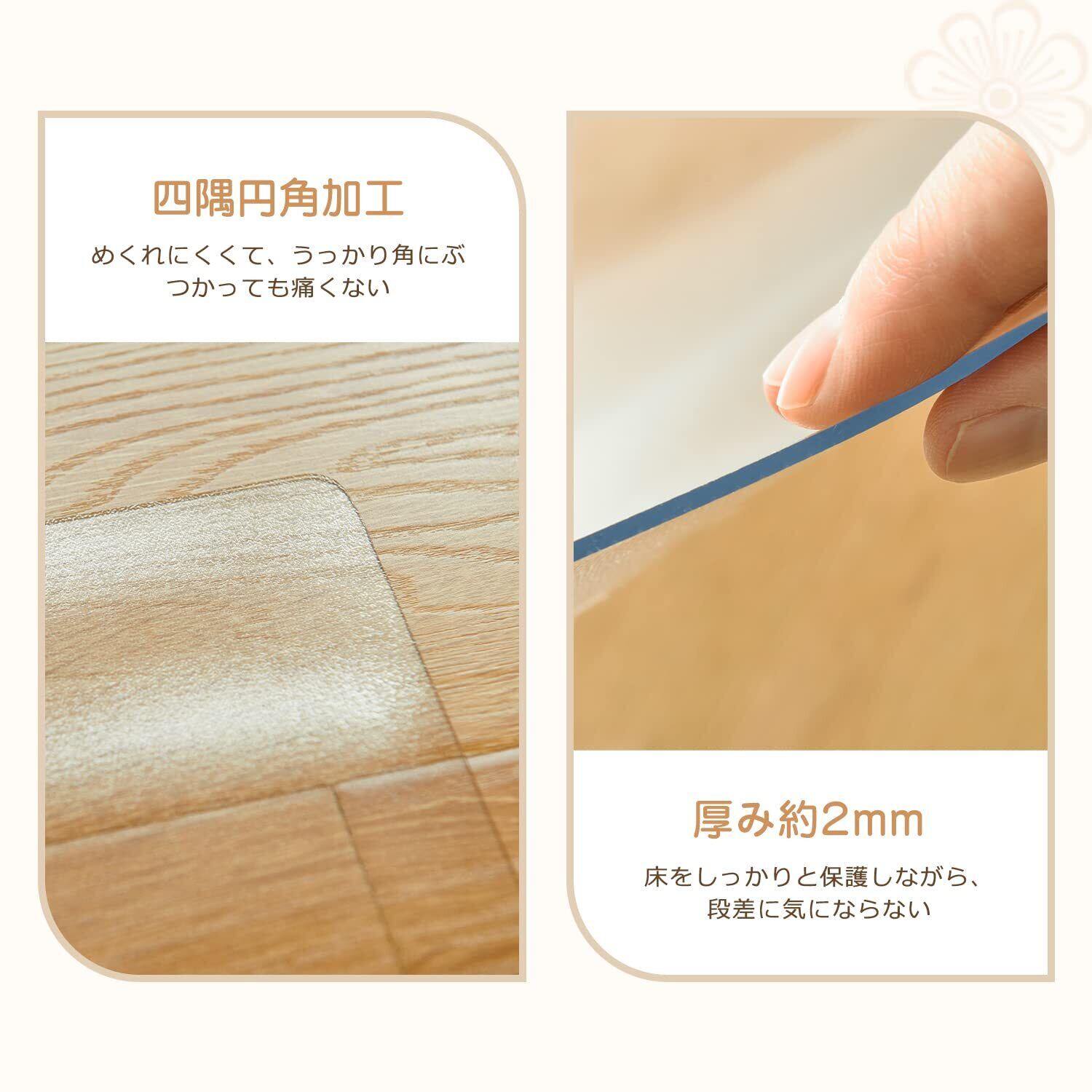 「本製品のポイント」1.床のキズ防止ができる。2.お手入れ簡単。防汚、防湿、防水性能あり、汚れても雑巾で拭くだけでキレイになる。3.丈夫で長持ち。耐荷重は約300kg、耐衝撃強度は硬質塩ビの約200倍になる。4.安全。地震などの災害や、強くぶつかっても破損・飛散しない。5.床暖房に対応可能。6.無毒無害。認証機関「TUV NORD」の有害物質試験に合格。7.収納便利。8.滑り止め加工あり。