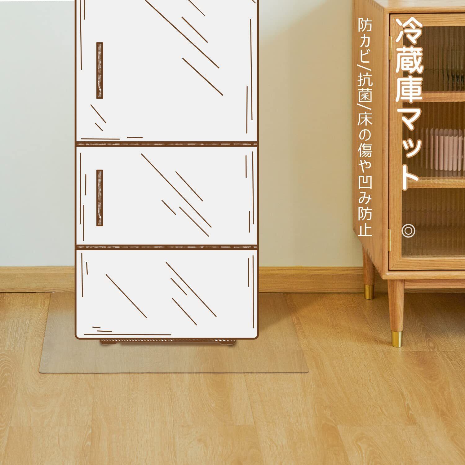 「床キズ、凹み防止マット」耐荷重は約300kg、ほとんどの冷蔵庫に対応できる。冷蔵庫の重みにより床の凹みや、置く時の摩擦によるキズを防げる。本製本の厚みは2mmで、薄めの製品より耐久性が良くて、変形しにくく、長期使用に敵する。