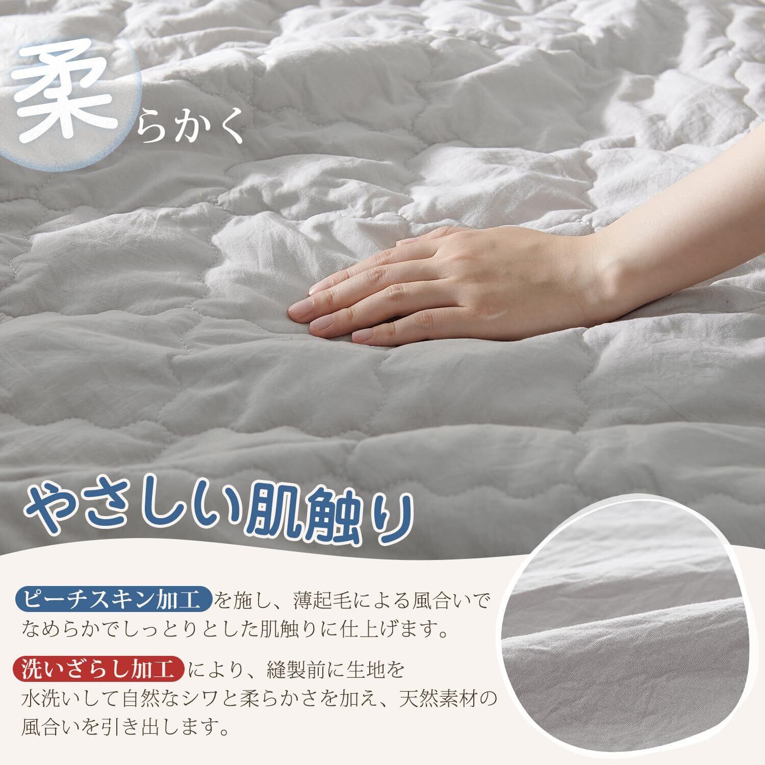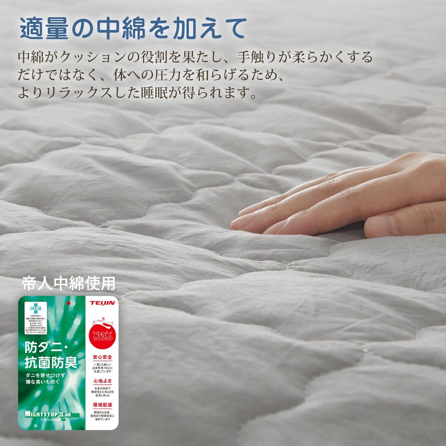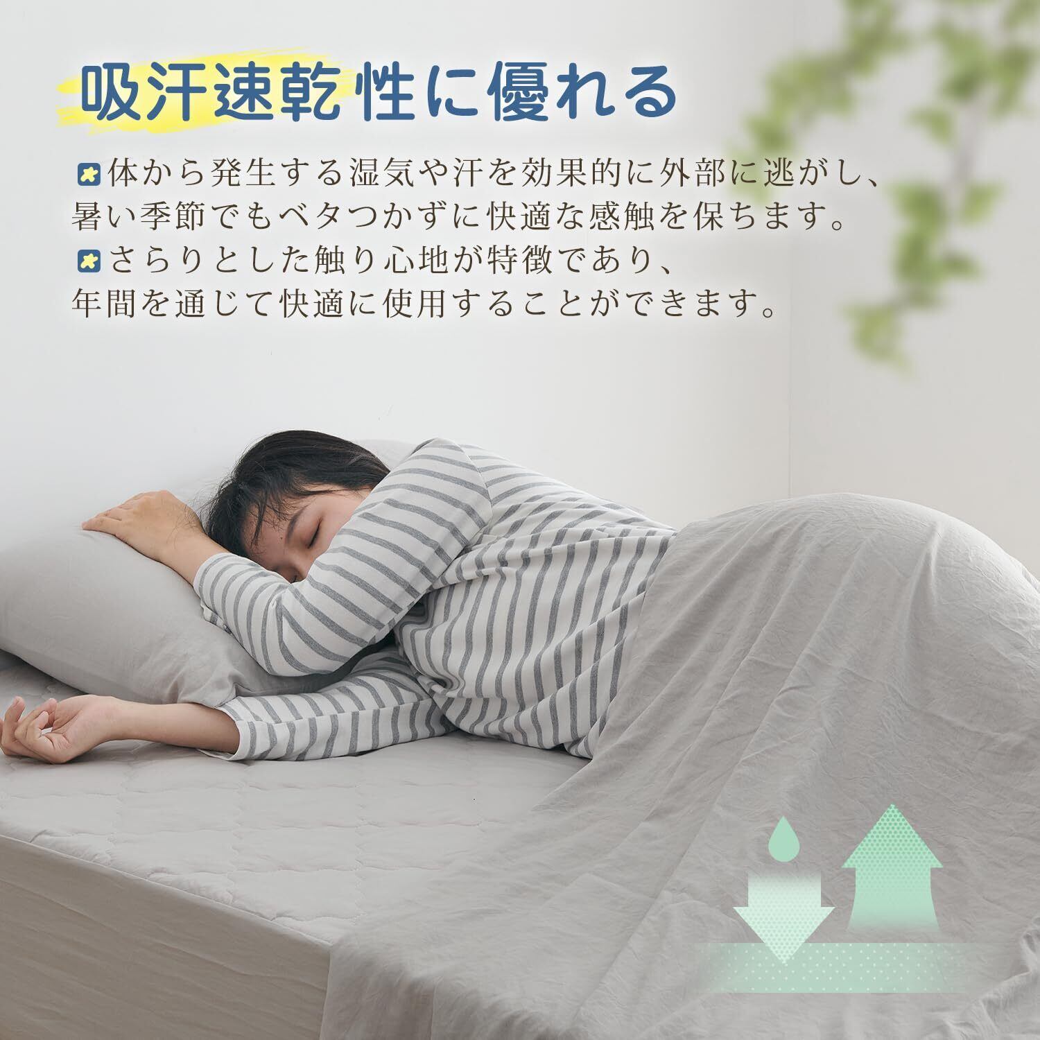 「通気性と速乾性」:通気性が高いため、シーツの中で湿気がこもりにくく、快適な寝心地を提供してくれます。また、このシーツは中綿が入っているにも関わらず、速乾性に優れています。洗濯後に素早く乾くため、いつも清潔な寝場所を保ちます。