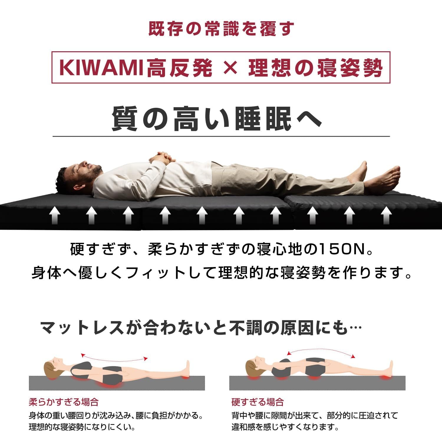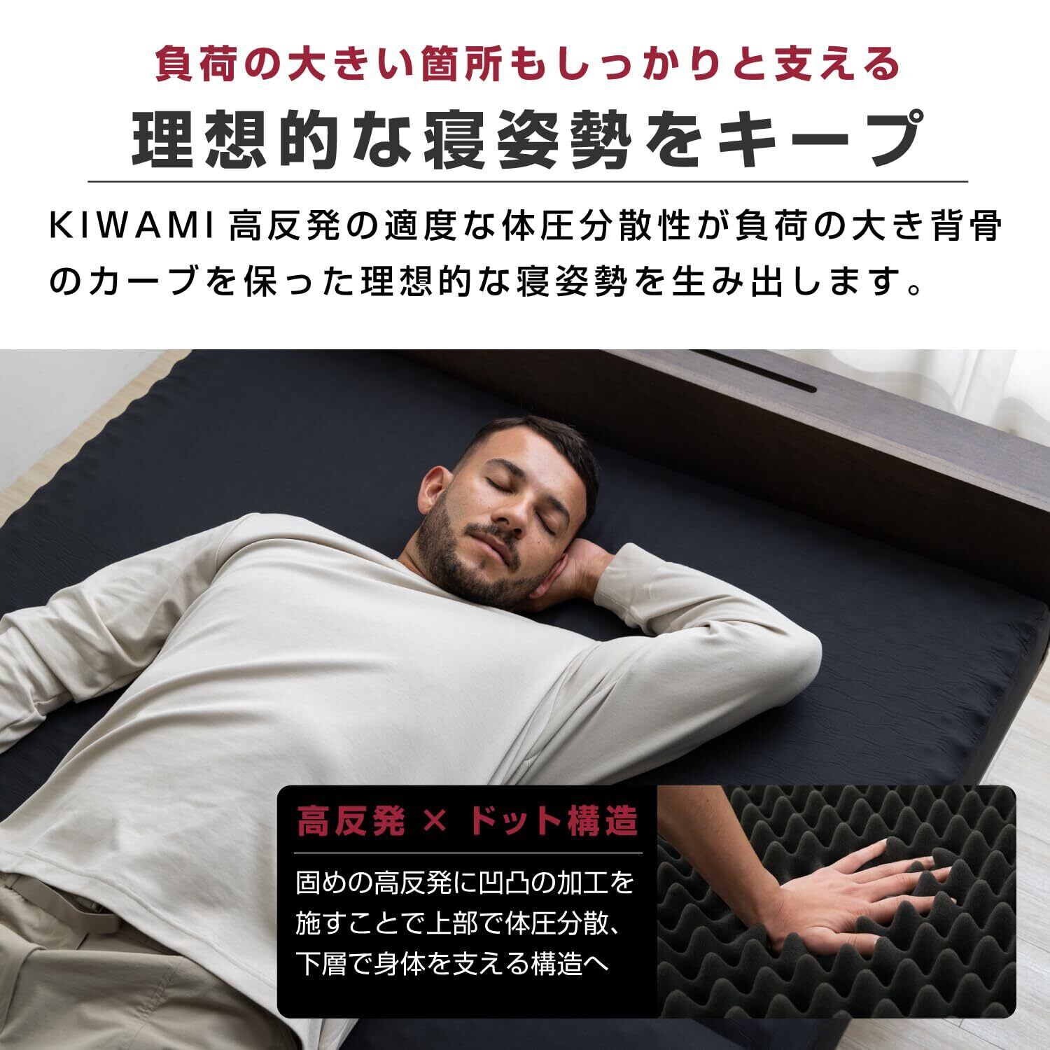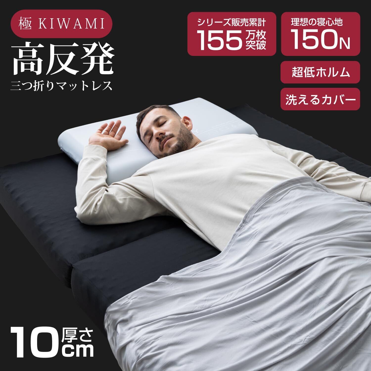 【極とは】 【極】高反発マットレスは、硬すぎず柔らかすぎない絶妙な硬さで、どんな寝姿勢にもフィットします。極厚10cmのウレタン素材が、体をしっかりと支えながらも、ふんわりとした寝心地を実現。三つ折り式で収納も簡単で、使わない時はコンパクトに折りたためるため、スペースを有効活用できます。