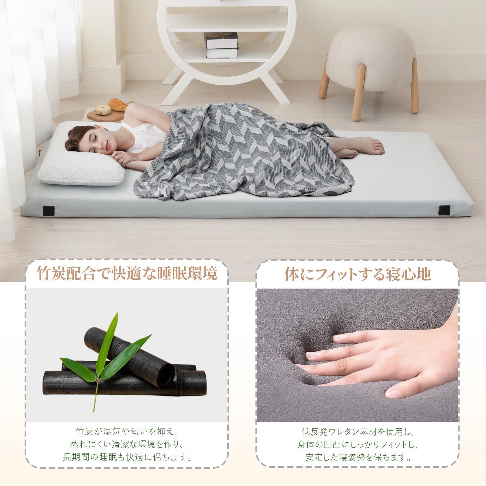 【竹炭ウレタンで防菌・防臭・快適寝心地】竹炭メモリーフォームを使用し、消臭・抗菌・吸湿性に優れています。臭いや湿気を抑え、快適な睡眠環境を実現。低反発素材が体圧を分散し、背中や腰に負担をかけず、リラックスした寝心地を提供します。キャンプや車中泊でも、まるで自宅のような快適さを実感できます。