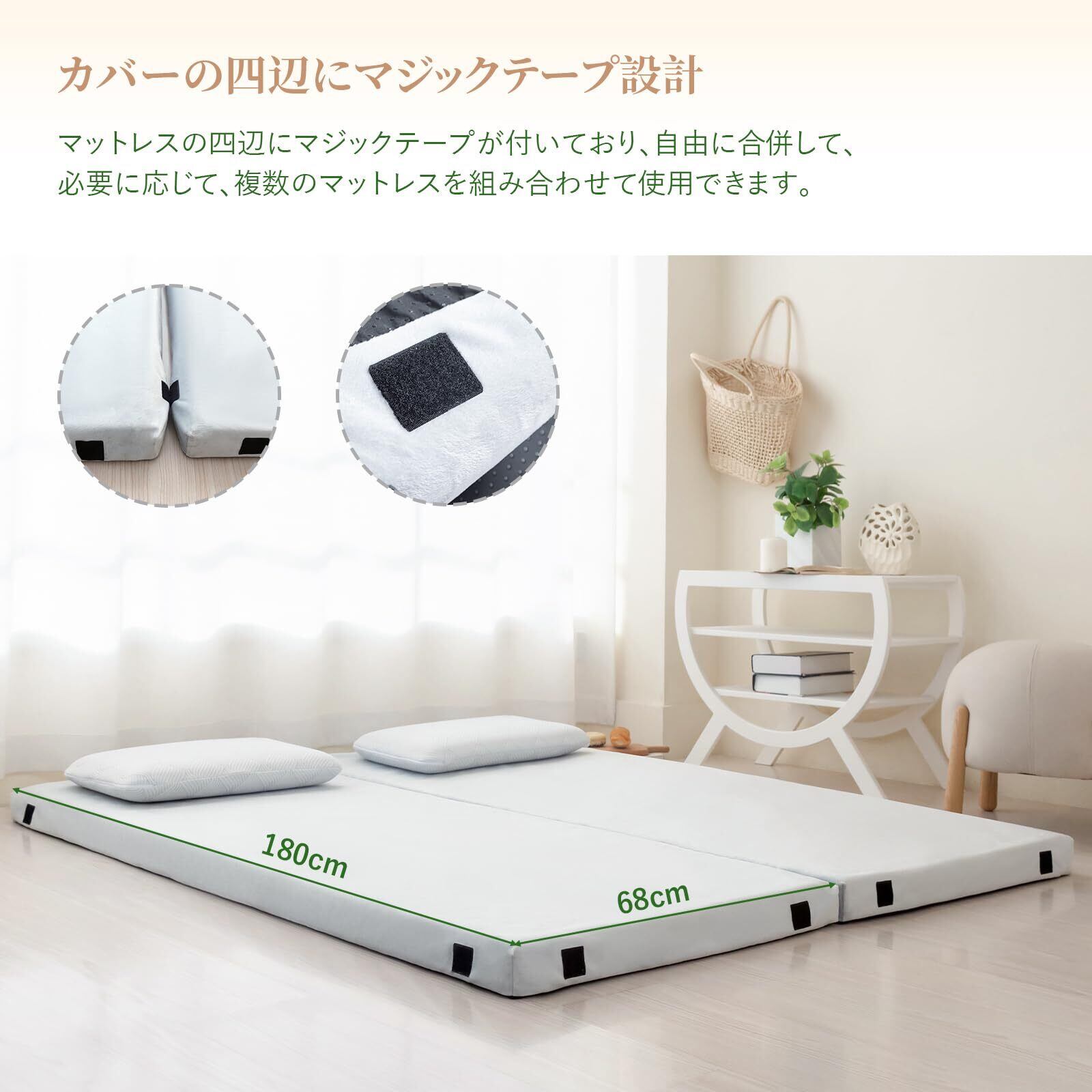【マジックテープで連結可能!フレキシブルな使い方】カバーの四辺にマジックテープが付いており、複数のマットレスを連結して大きなベッドとして使えます。家族や友人とのキャンプ、急な来客時にも便利。使用シーンに合わせて自由にレイアウトできるので、使い勝手が抜群です。