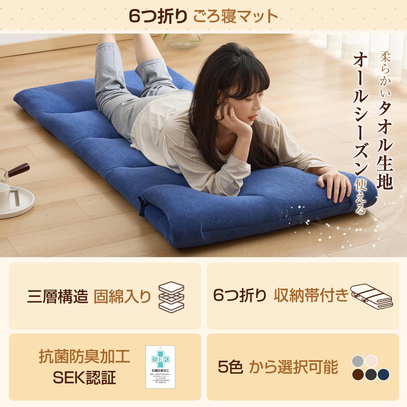 【抗菌防臭加工&SEK認証】抗菌防臭性のある高機能中綿を採用し、いつまでも清潔に使いたい方や、繊維アレルギーが心配な方に特にオススメです。本製品はISO9001認証工場で生産されており、SEK認証を取得しており、安全がされており、低ホルムアルデヒドで毎日使っても安全です。このようなごろ寝マット長く使えて小さいお子様にも安心です。