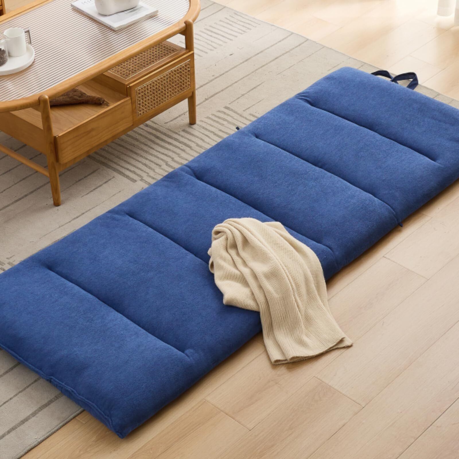 ごろ寝マット 6つ折りお昼寝マット タオル生地 長座布団 折りたたみごろ寝布団 ゴロ寝 ごろね おひるね ロングシートクッション コンパクト 休憩 車中泊マットレス ポータブル 畳める 固綿入り 体圧分散 五層構造 収納用のストラップ付き 70*180cm ネイビー 折り目なしパッケージ