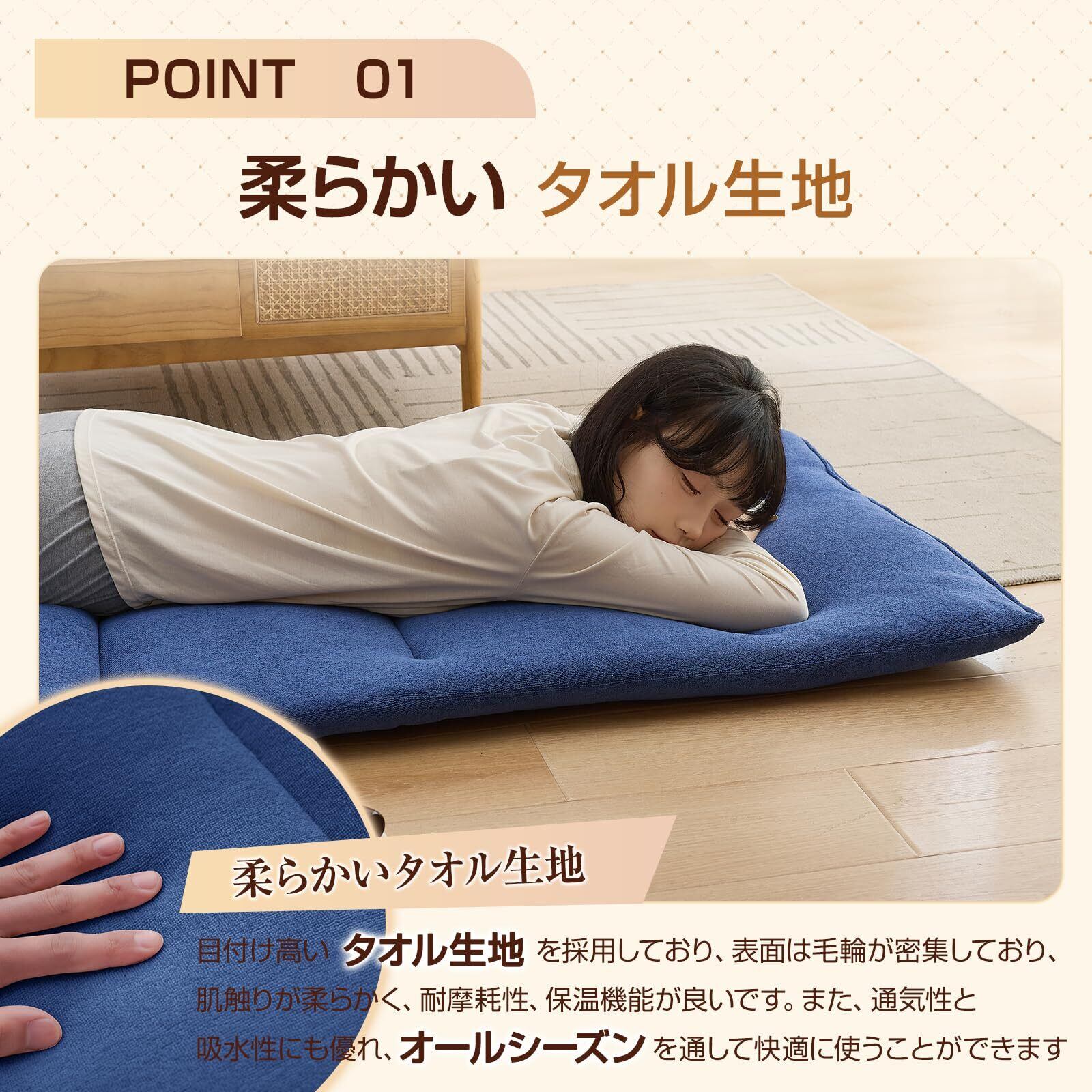 【柔らかいタオル生地&オールシーズン使える】目付け高いタオル生地を採用しており、普通の生地と比べるとはるかにさらっとした肌触り持っております。表面は毛輪が密集しており、肌触りが柔らかく、耐摩耗性、保温機能が良いです。目付けがアップグレードされ、さらに丈夫で破れにくいです。また、通気性と吸水性にも優れ、吸収した水分は外に発散されるので、オールシーズンを通して快適に使うことができます。ごろ寝マットはキルティング製になっていますので、型崩れしにくく丈夫です。