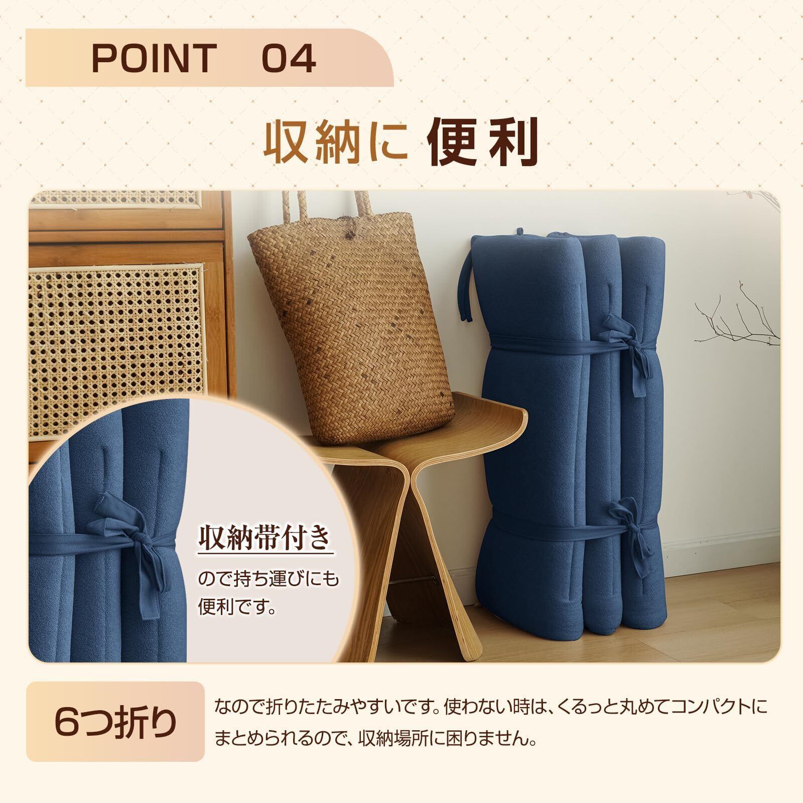 【6つ折り&収納帯付き】5つ折りなので5つの部分があるので、使い方はとても自由です。1か所を折り返して枕がわりにもでき、昼寝をするのに便利です。前の3つを立てて、壁にもたれかかってソファーにすることができます。床に直接置くことができ、座布団として150 cmの長さで来客用にも十分です。マットレスとしても使え、キャンプ、車中泊、看病増床、夜勤仮眠などのタイミングで大活躍です!使わない時は、くるっと丸めてコンパクトにまとめられるので、収納場所に困りません。収納帯付きので持ち運びにも便利です。