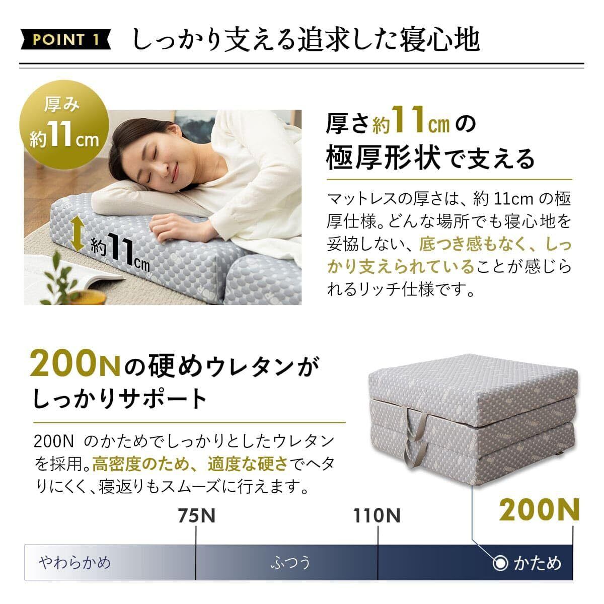 Point.1 しっかり支える追求した寝心地 ■リッチな厚み マットレスの高さは、約11cmの極厚仕様。 くつろぎ時間も寝心地を妥協しない、しっかり支えられ ていることが感じられるリッチ仕様です。 ■適度なかたさ 200Nのかためでしっかりとしたウレタンを採用。 高密度のため、適度な硬さでヘタりにくく、寝返りも スムーズに行えます。 ■丈夫でへたりにくい マットレスは、分厚くても密度が低いとヘタリがち ですが、高密度ウレタンを採用することで、耐久力 に優れたマットレスを実現しました。 ■最適な寝姿勢 ウレタンの表面が凸凹形状になっており、体圧分散 性に優れています。 点で支えることで、最適な寝姿勢をサポートします。