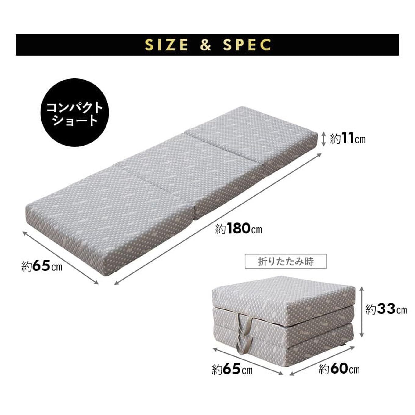 【サイズ】コンパクトショート:約65×180×11cm (折りたたみ時:約65×60×33cm) 【素材】 表生地:ポリエステル100%(ニット生地) 裏生地:ポリエステル100%(メッシュ生地) 中材:高反発ウレタンフォーム 密度32kg/m3 200N 【カラー】 グレー 【仕様】 コの字ファスナー開閉式 取っ手付き(2本) 【お手入れ方法】 側生地:ご家庭の洗濯機でお洗濯できます。 ※洗濯ネットをご使用下さい。