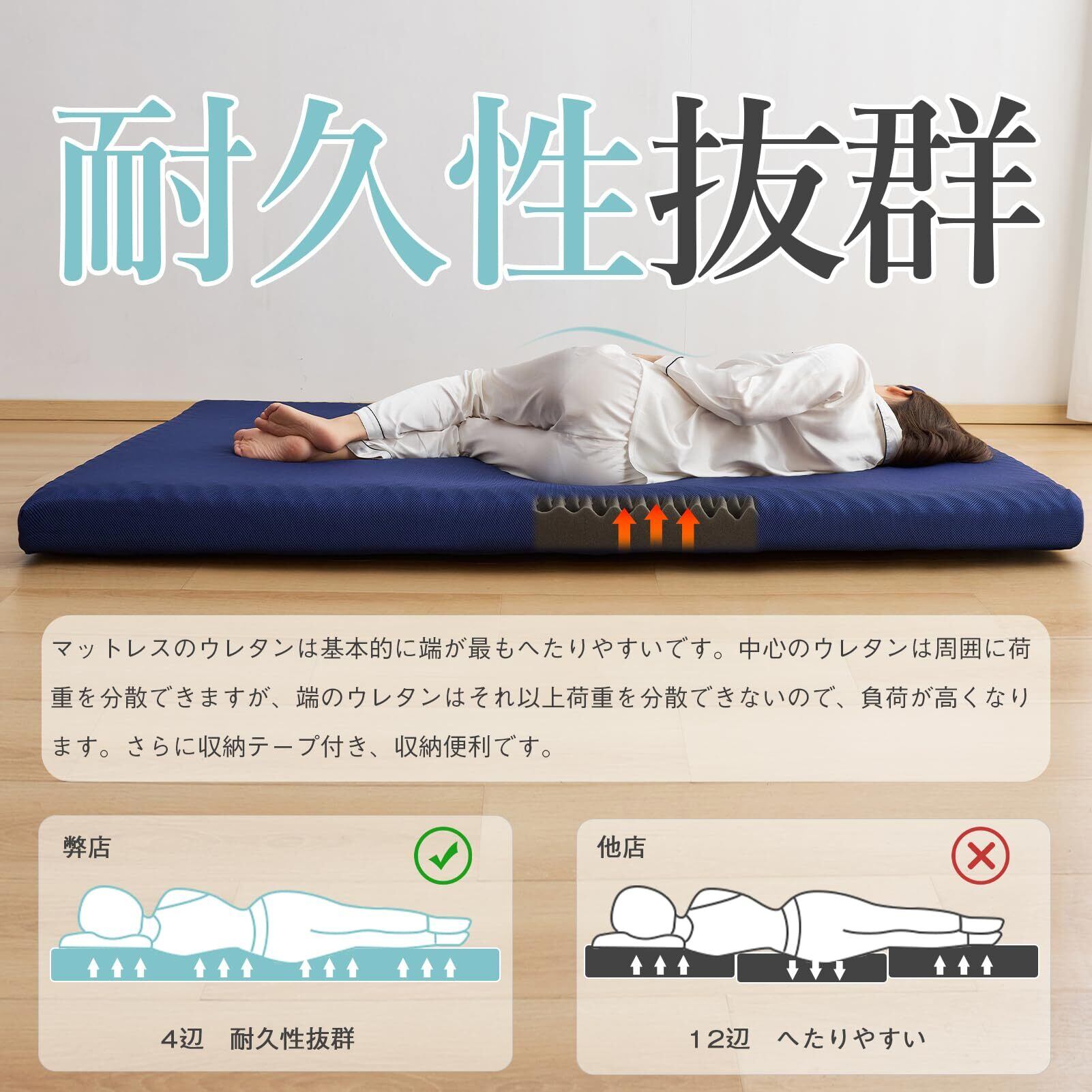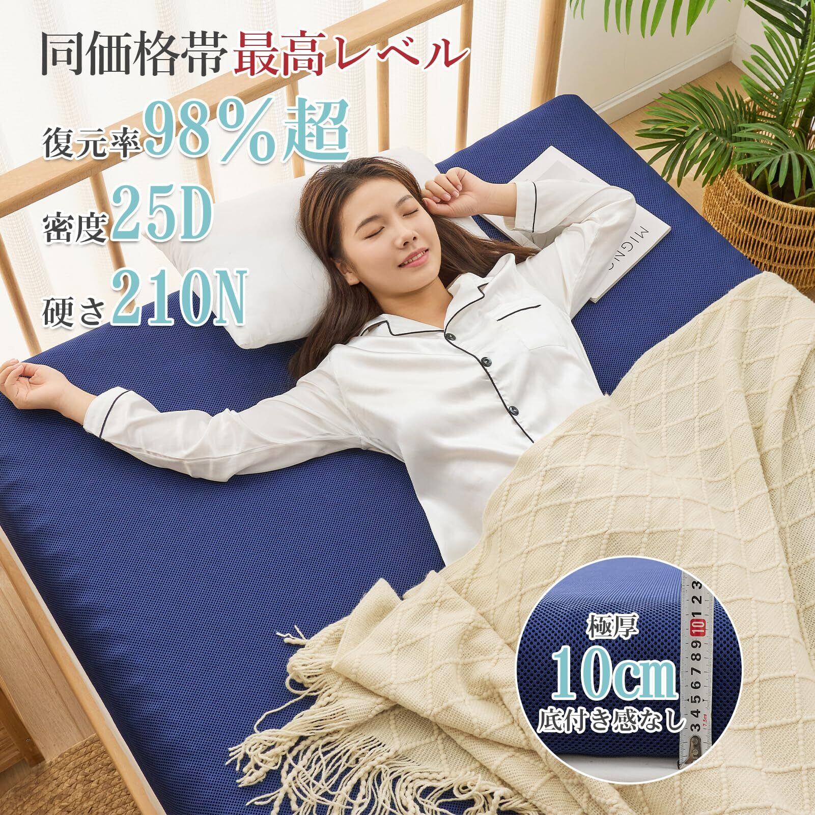【高反発素材】圧縮梱包で届いています。開封後、風通しの良いところで3-7日間置いて、回復できます。マットレスが元の形に復元しにくい場合は、手で軽く叩いて、或いはドライヤーで温めていると復元時間が短縮できます。マットレスは高反発素材を採用しており、優れた復元性とクッション性を兼ね備えています。密度25Dで、ぐっと押しても、すぐに戻る高反発マットレスです。全身をバンランスよく支え、過度の沈み込みのない快適な寝姿勢を作り出します。10㎝厚みがあるからベットにそのまま使用できます。床敷でも畳でも使えます。210Nの程よい硬さで、しっかり体を支えています。復元率98%で、長期間使用していても形崩れにくく、長く愛用できます。