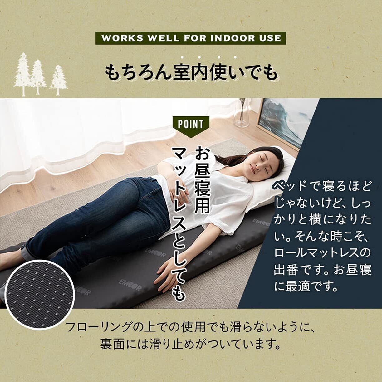 POINT5 もちろん室内使用でも ベッドで寝るほどではないけど、しっかりと横になりたい。 そんな時こそ、ロールマットレスの出番です。お昼寝に最適です。 裏面は滑り止め付きです。