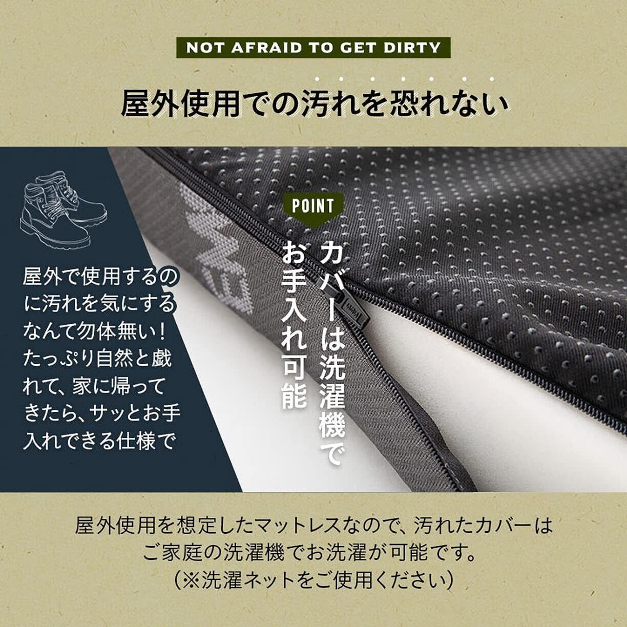 POINT3 屋外使用で見逃せない携帯性 超軽量の約1.72kg。ロール状にすれば、持ち運びラクラク。 お子さんでも持ち運びできるサイズです。 POINT4 屋外使用での汚れを恐れない 屋外使用を想定したマットレスなので、汚れたカバーはご家庭の洗濯機でお洗濯が可能です。 ※洗濯ネットをご使用ください。