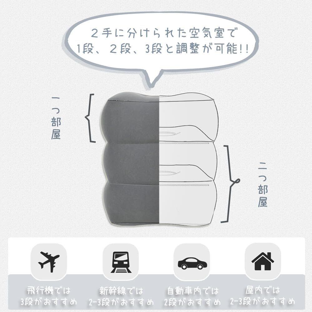 【3段階高さ】2気室に分かれており、使用する場所や、普段慣れている高さに合わせて、3段階の調節が自由にできます。自動車内では座席と同じくらいの高さの2段がおすすめ。新幹線、飛行機では3段の高さがおすすめです。