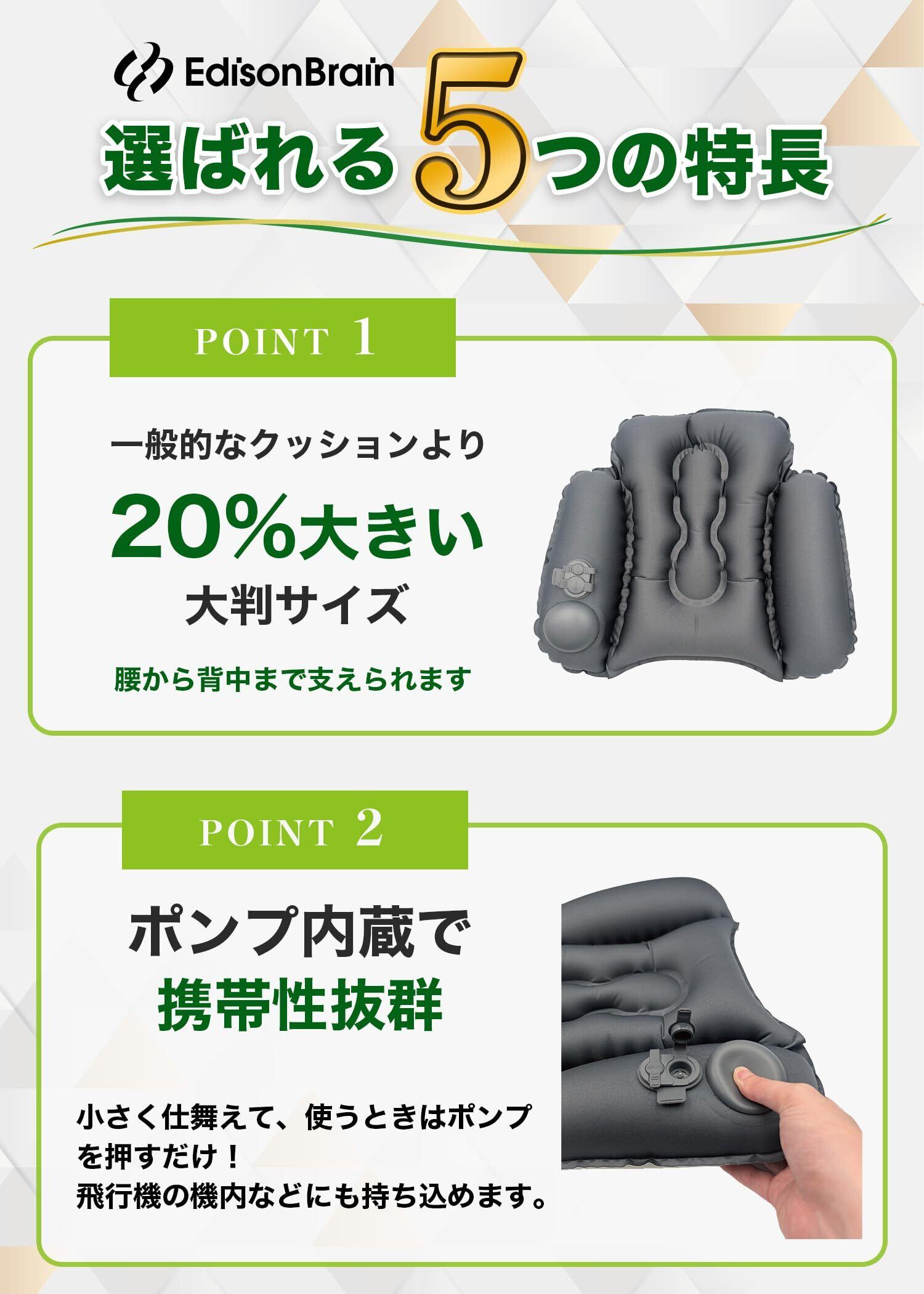 【衛生的】エアータイプのクッションは口で膨らませるタイプが多いため、衛生的ではありません。当店のクッションはポンプを内蔵しているため、口に触れることが無く非常に衛生的です。