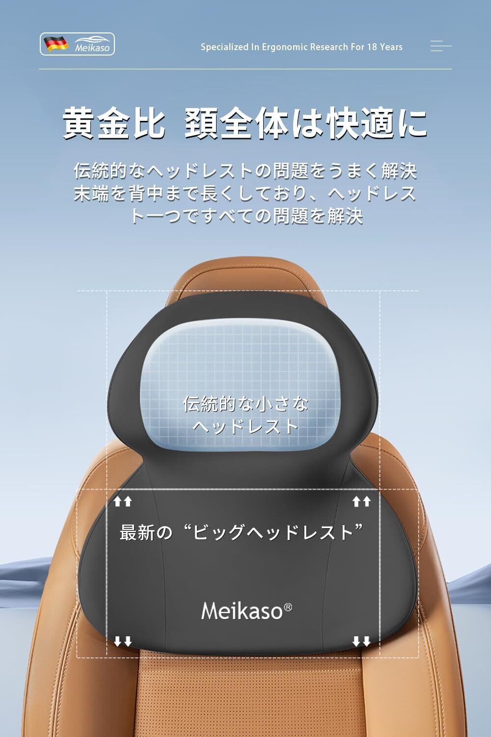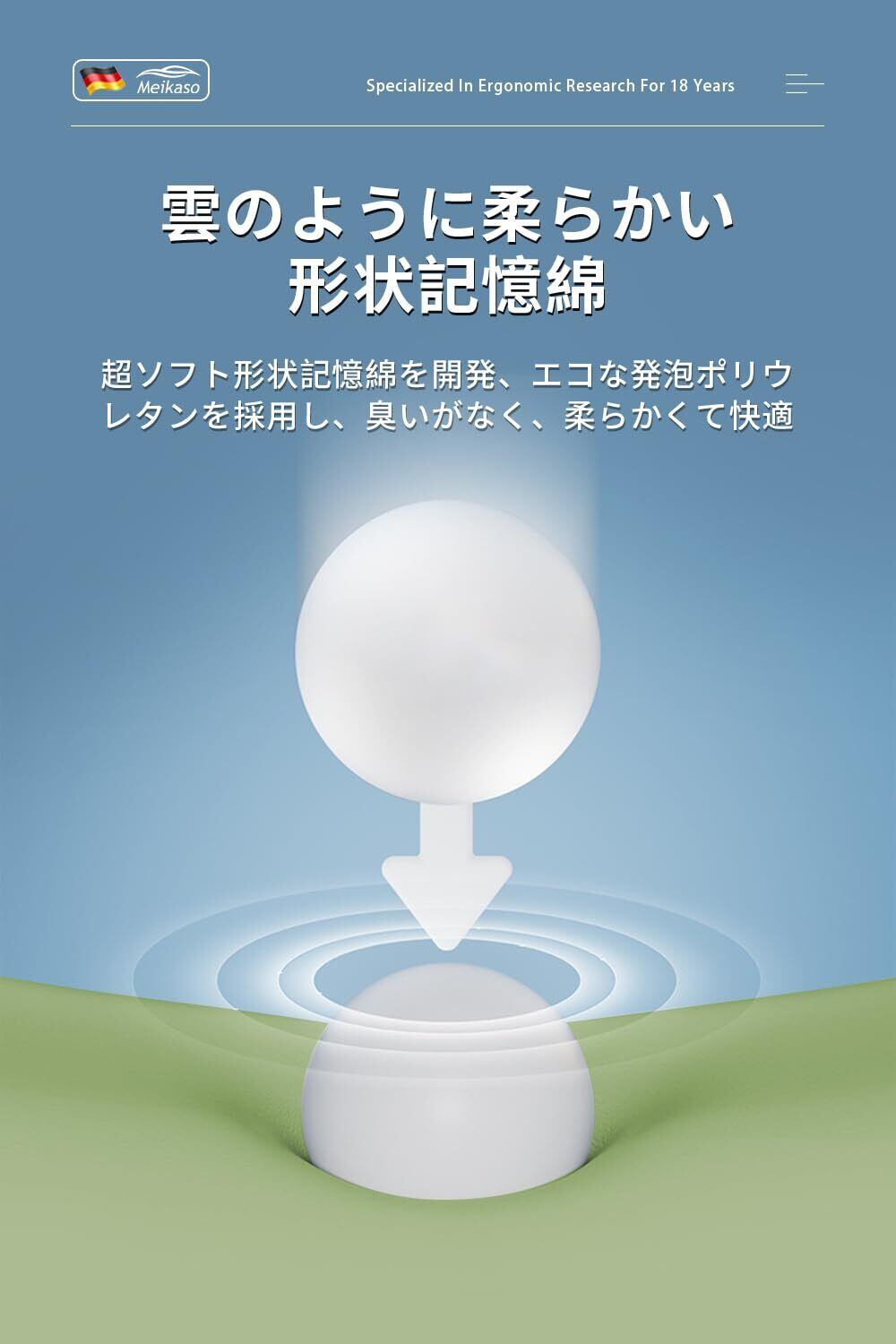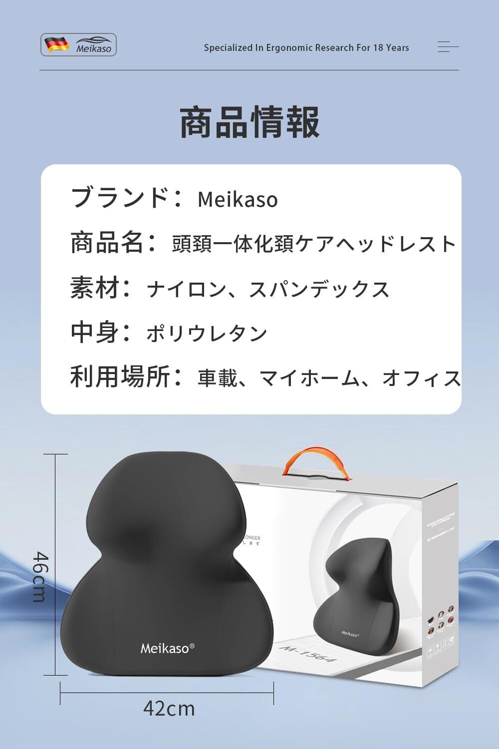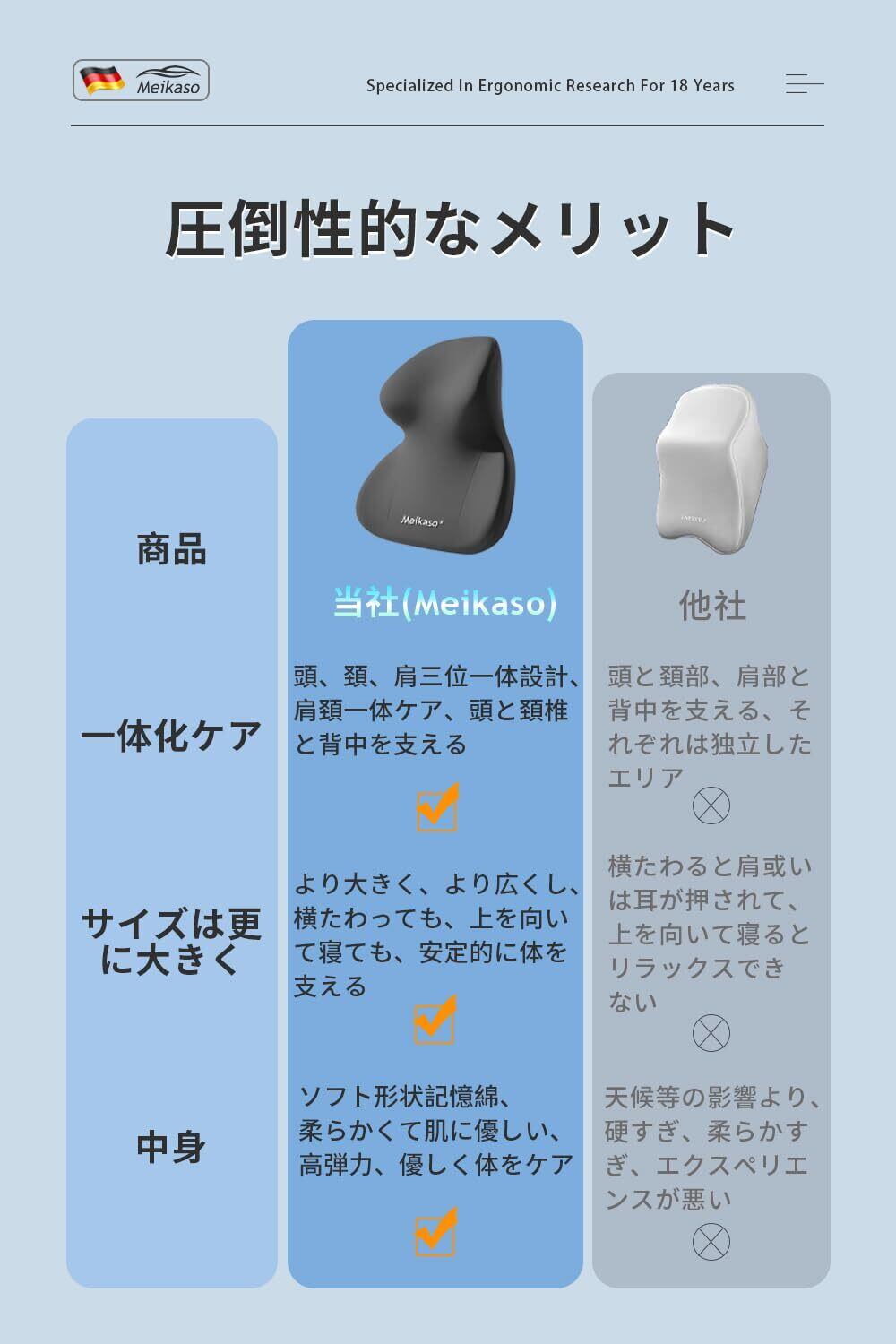 【創り上げる理想的な美姿勢】Meikasoは累計販売データと数年間の繰り返しのテストにより、モダンファッションのネックピローをデザインしました。ドイツ輸入のメモリーコットンは採用します。頭、首、肩の3つを一体化したデザインで、頭、首、背中に寄りかかるものがあり、快適で居心地のよい、オールラウンドなコンディショニング・ケア。
