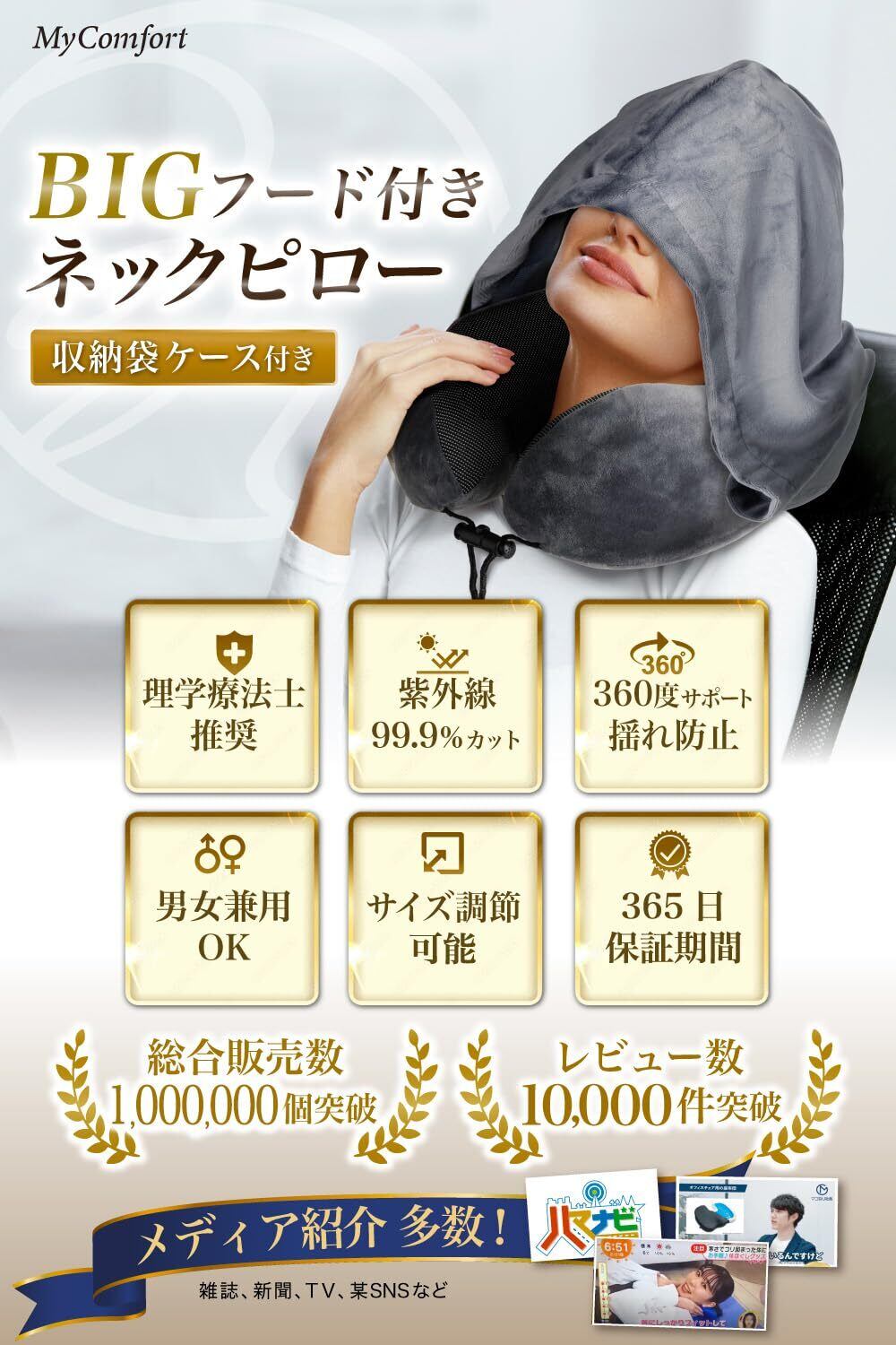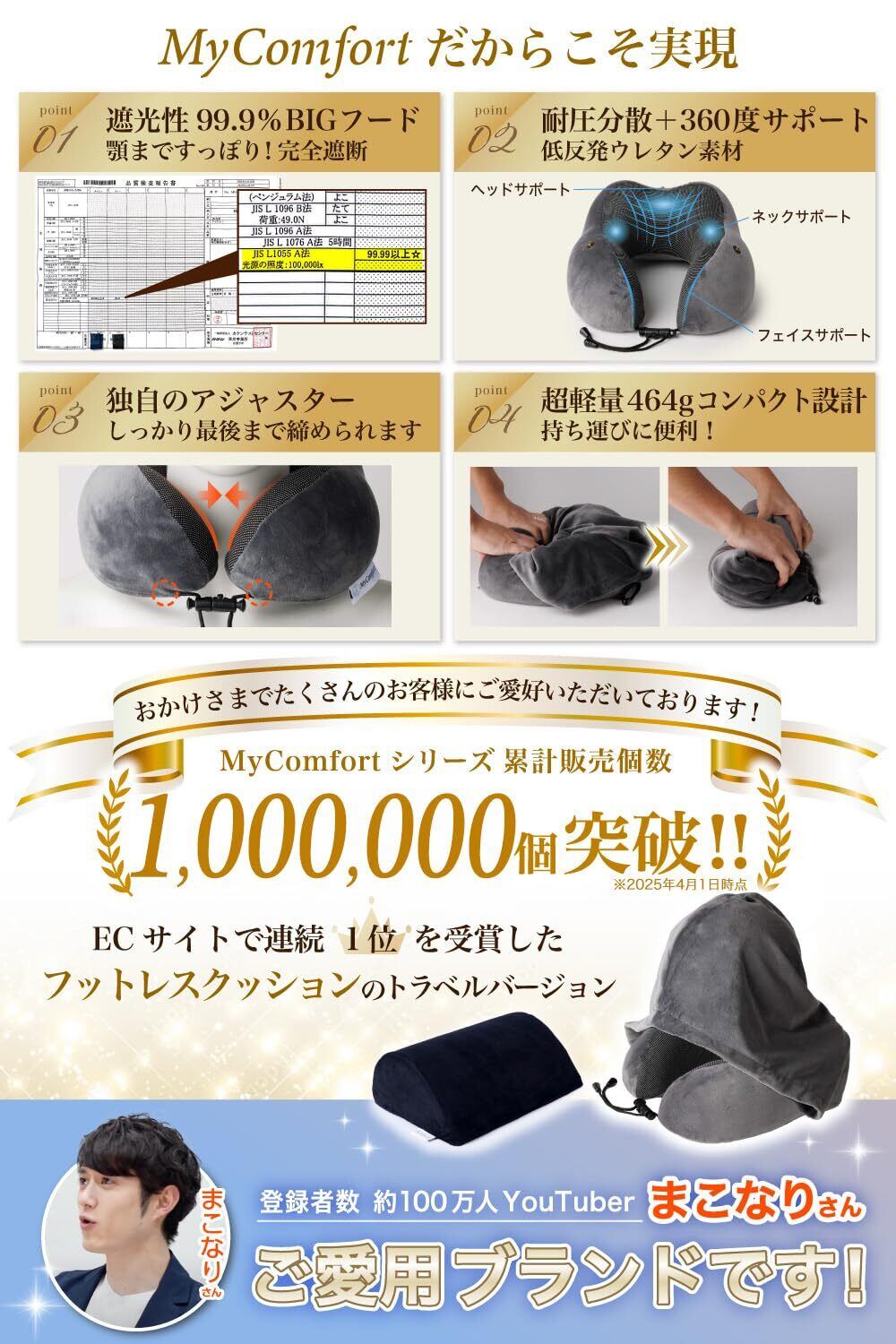 【最高級の低反発素材を採用】マイコンフォートはクッションはフットレストなど低反発ウレタン素材を活用した商品を多数開発。最高級の低反発ウレタン素材を活かし、旅行用のネックピローの開発に成功しました。360度のサポートと完全調節可能なアジャスターが頬、顎、首までサポートし、うつ伏せ寝などのあらゆる姿勢にも対応。高品質なウレタン素材を採用しているため、体圧・頭圧分散(一箇所に圧力が掛かりすぎない設計)も高く、どんな体型にもピッタリとフィットし、快適な姿勢をキープできます。travel(トラベル)中、移動中の首の疲れ、だるさ、痛みの心配はありません。