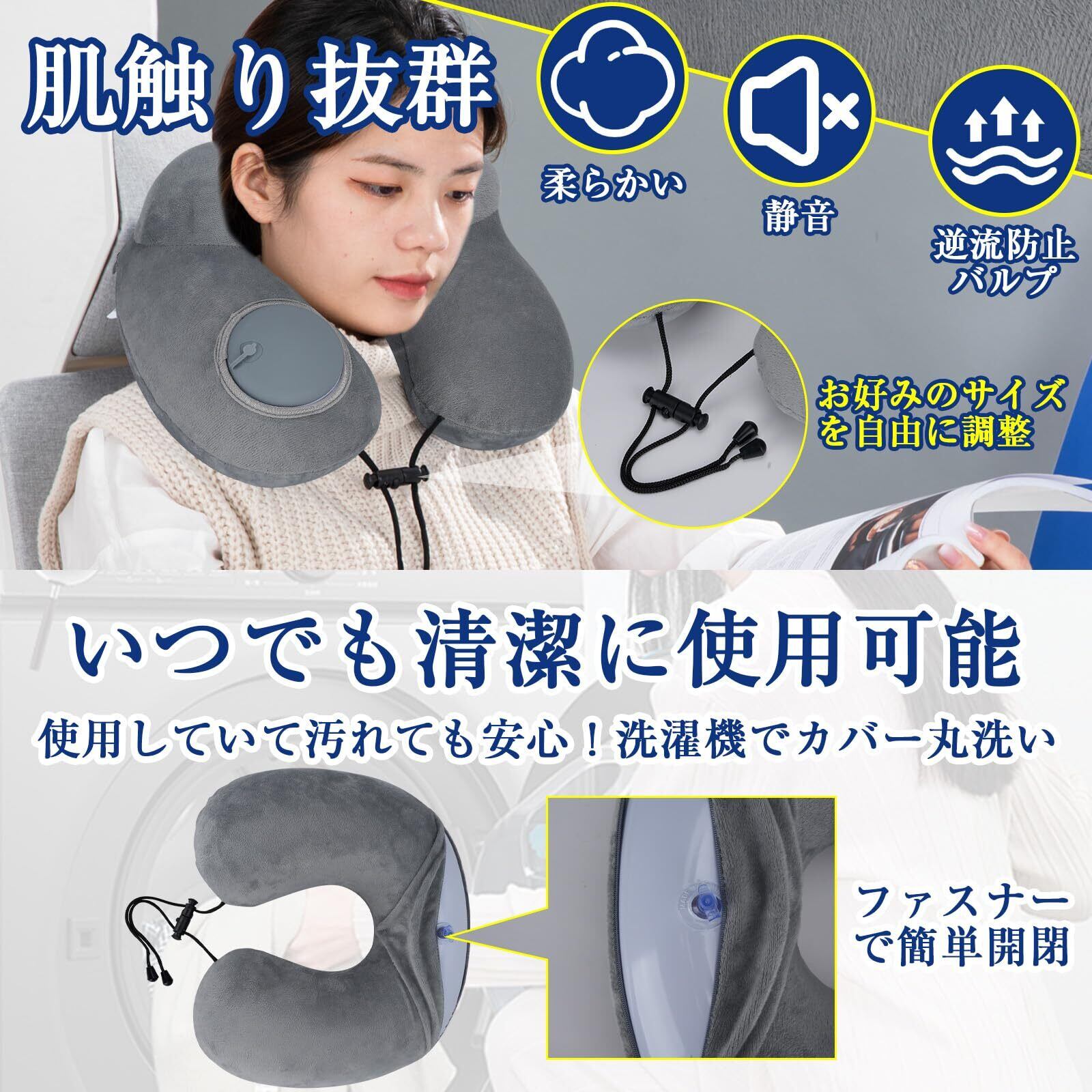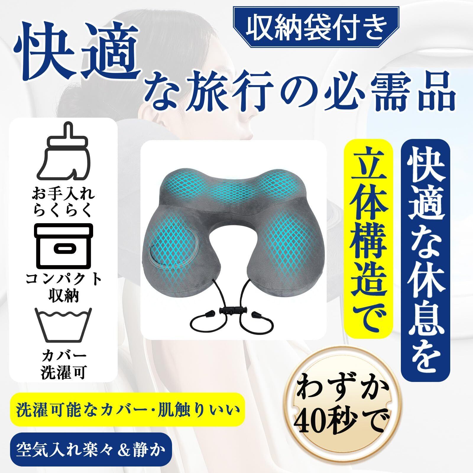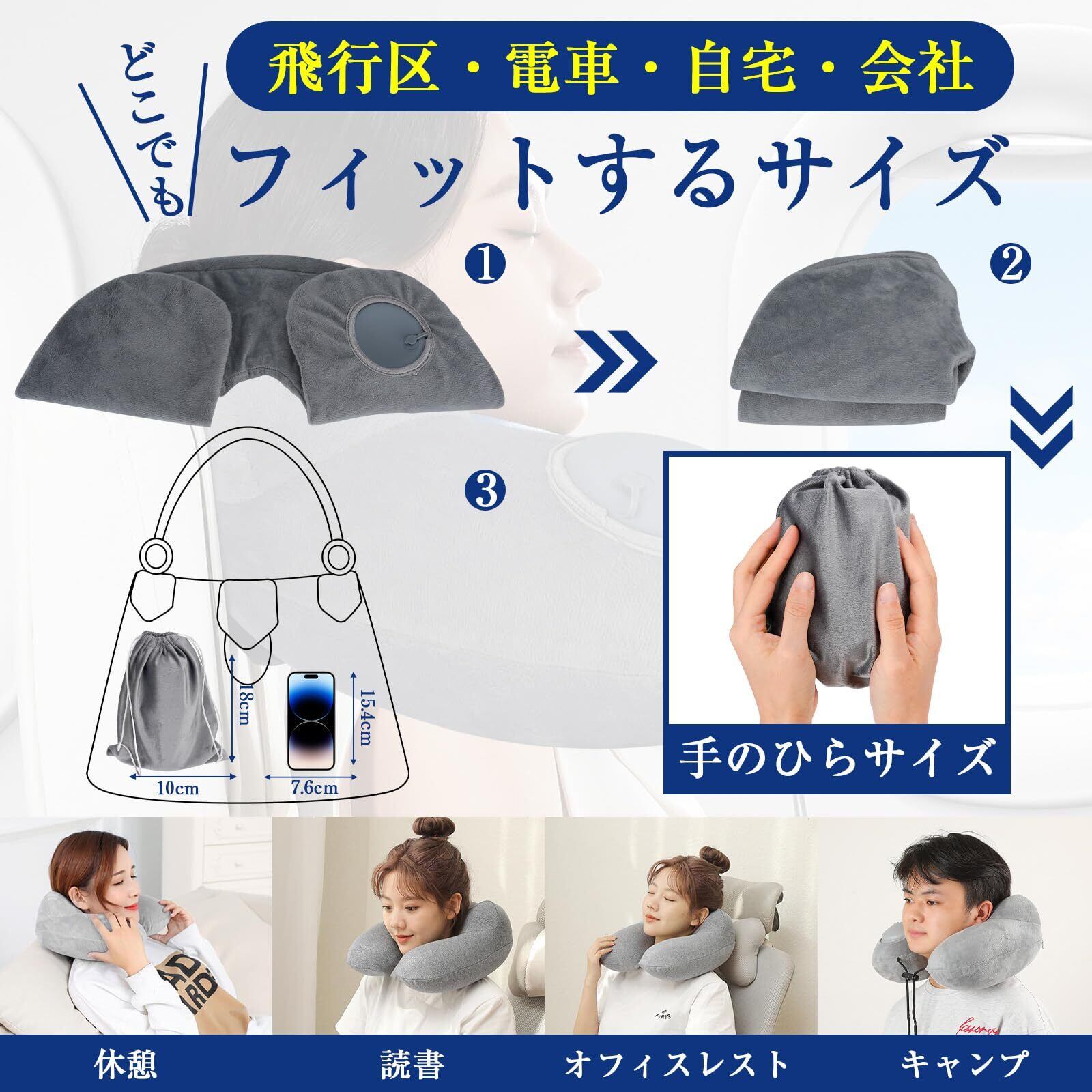 ネックピロー 首枕 携帯枕 U型 旅行用 旅行便利グッズ 収納袋 洗えるカバー エアーピロー プレス式膨らませる ネックピロー 飛行機 オフィスグッズ 自宅 バス (グレー)