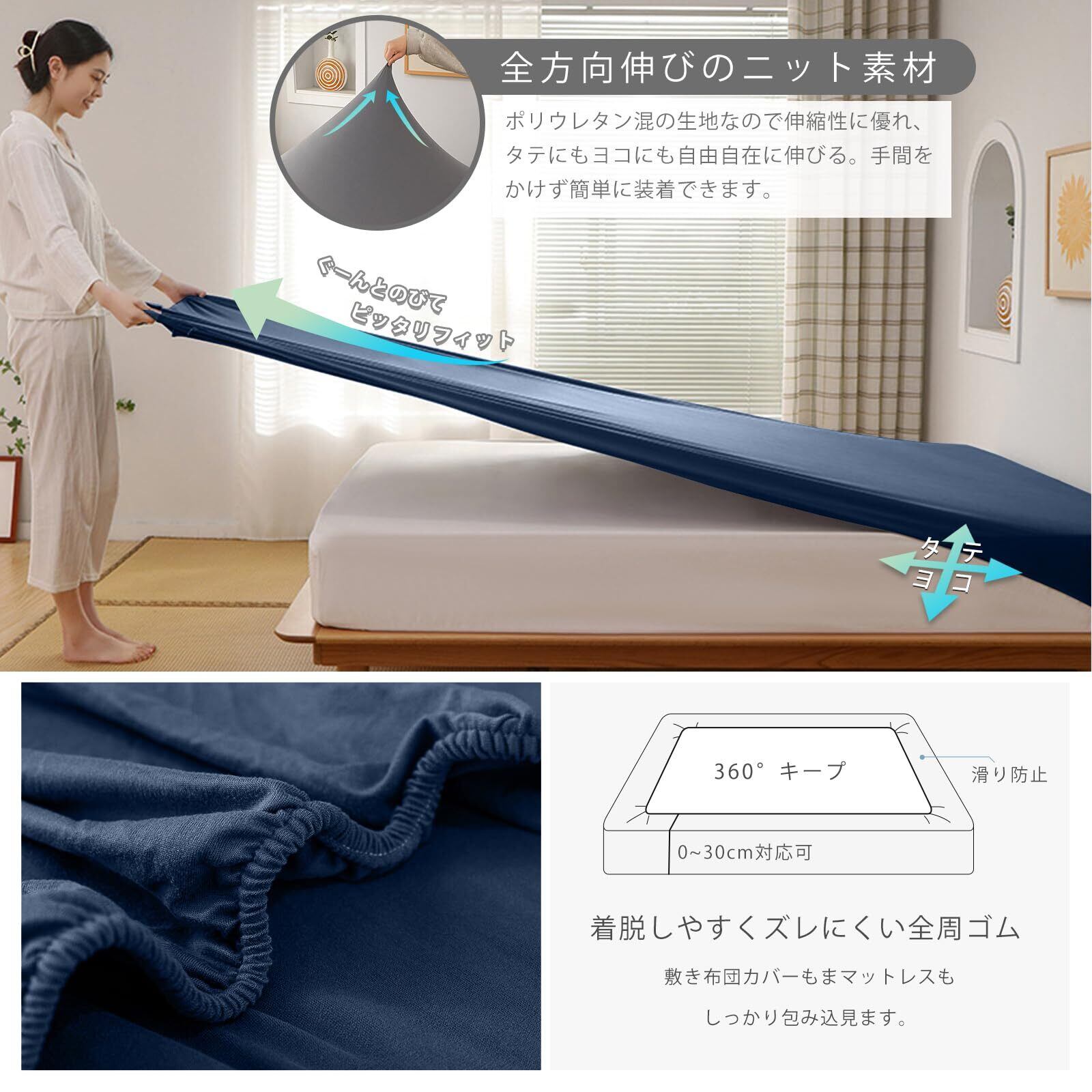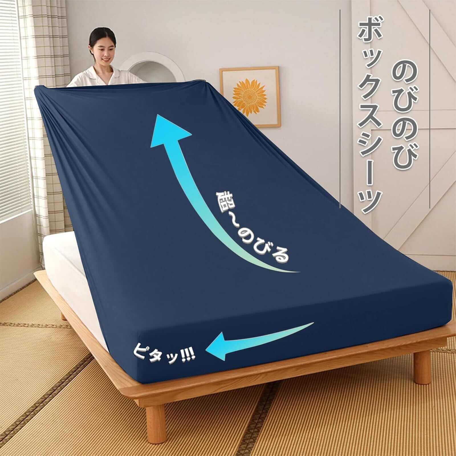 【3Dストレッチ生地&伸びるベッドシーツ&アイロン要らず】お客様のご要望にお応えできるように、仕上がりの美しい、綺麗にフィットするシーツを作りました。ポリウレタン混の生地なので伸縮性に優れタテにもヨコにも自由自在に伸びる素材だから手間をかけず簡単に装着できます。半端なサイズもキレイにフィット。シワになりにくいから気になる取り付け時のシワも アイロンいらずでキレイにフィット。面倒家事も短縮できます。