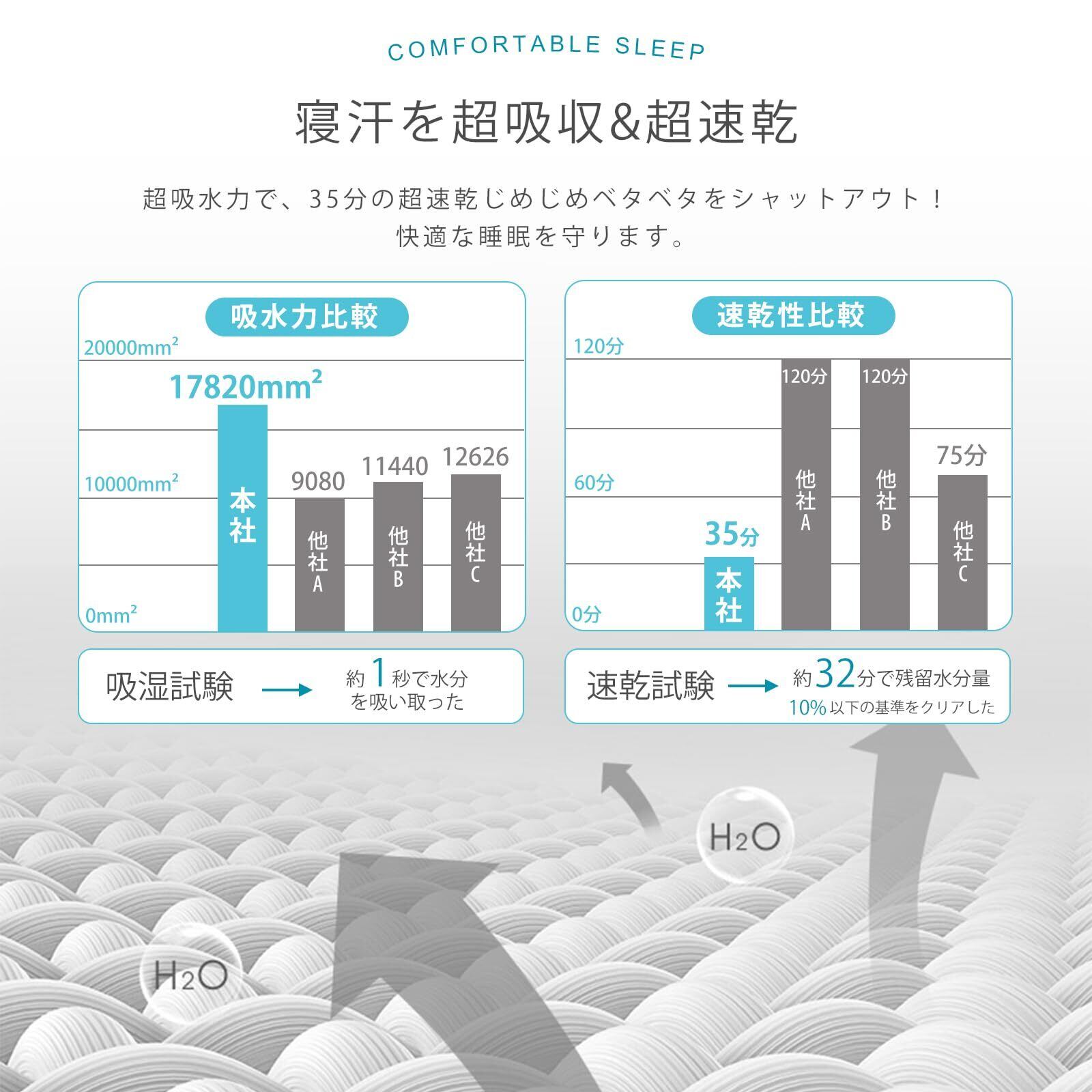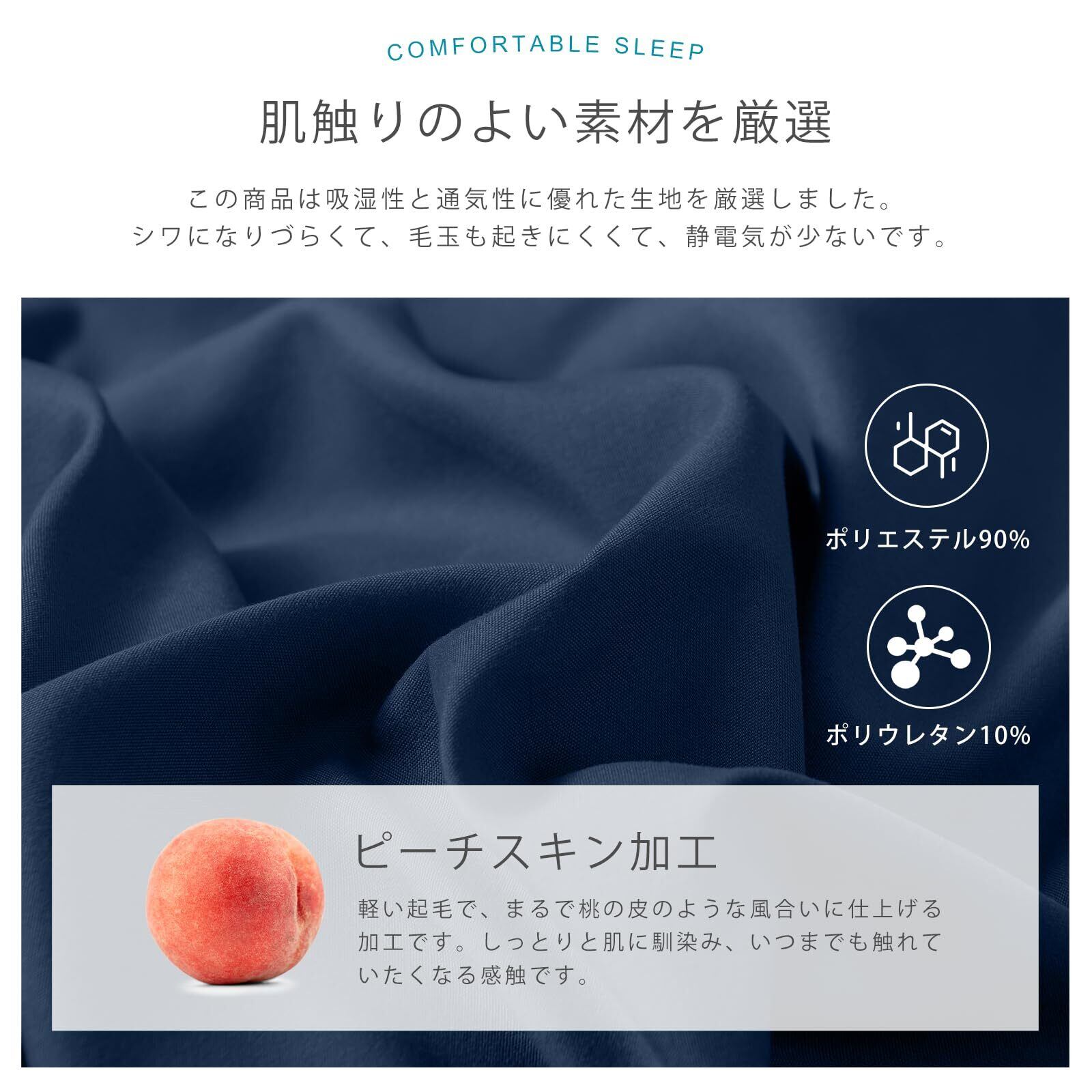 【吸水速乾·防ダニ·肌に優しい・高密度素材】素材はポリエステル90%。直接お肌に触れるものなので、この商品は吸湿性と発熱性に優れたポリエステル生地を厳選しました。ポリエステルはシワになりづらくて、乾きやすい軽量素材です。吸水速乾タイプなので洗濯機で丸洗い後、比較的短時間で乾きます。ダニの栄養分となるケア、アカ、湿気などをマットレスに溜まらないのため、安全のダニを抑制します。柔軟なピッチスキンのポリエステルに抗菌防臭加工を施しており、柔軟でお肌の敏感な方やお子様にも毎日にご安心に使用できます。さらに、高密度生地で丁寧に織り上げることにより、耐久性が高く、長くご使用いただけます。