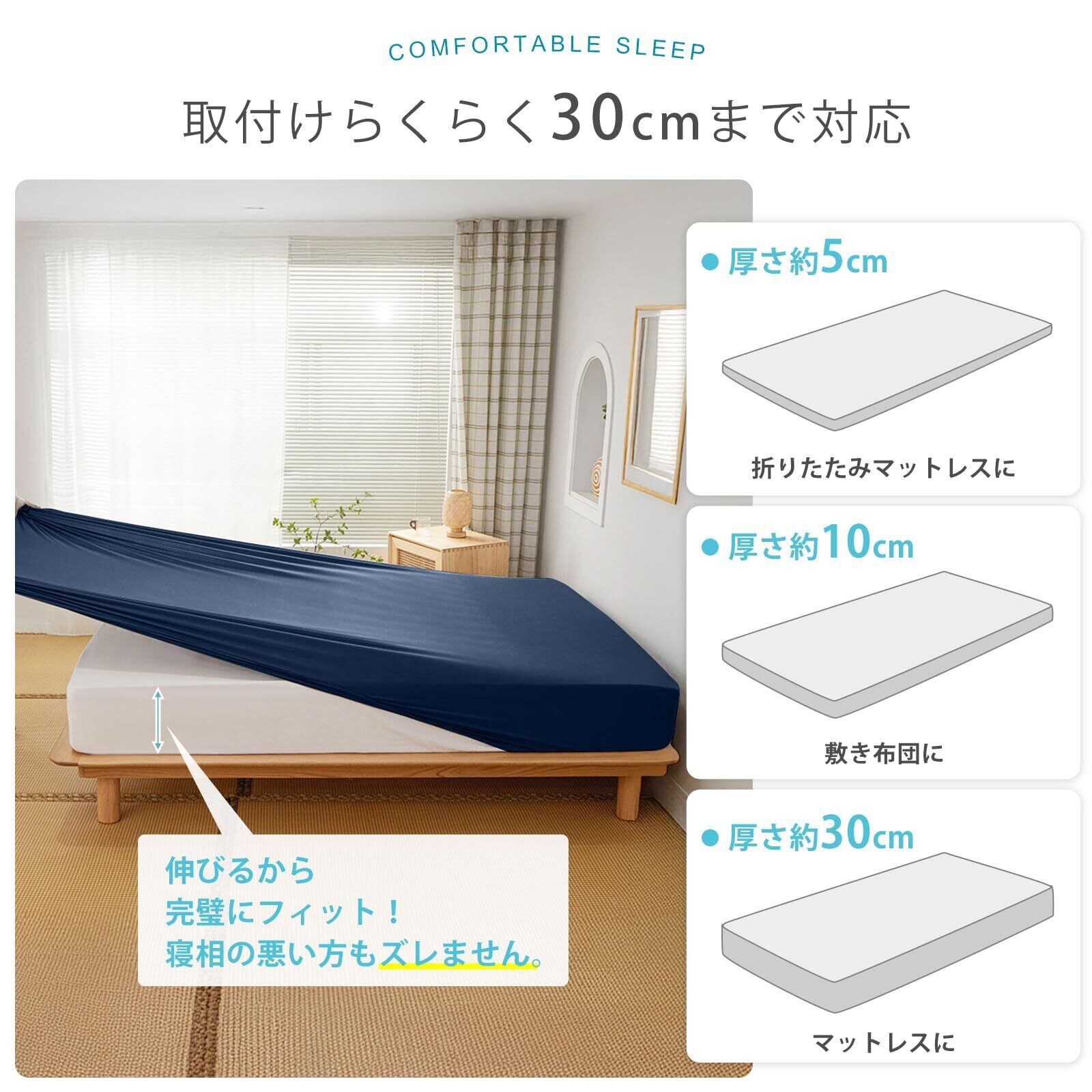 【マチ30cm·ボックスタイプ】だた30秒で着脱可能!Valleinボックスシーツ全周囲ゴムを裁縫されており、普通の20cmよりマチ部分は30CMに伸ばして、30cmほど厚いマットレスでも四角が簡単でぴったり包まれ、ラクラク着脱できます。また、ゴムバンドに360度巻かれているので、どんなに寝相が悪くてもずれることはなく、マットレスもすっきりと保護してくれます。さらに、ベッド、マットレス、布団など多くの寝具に使用できます。