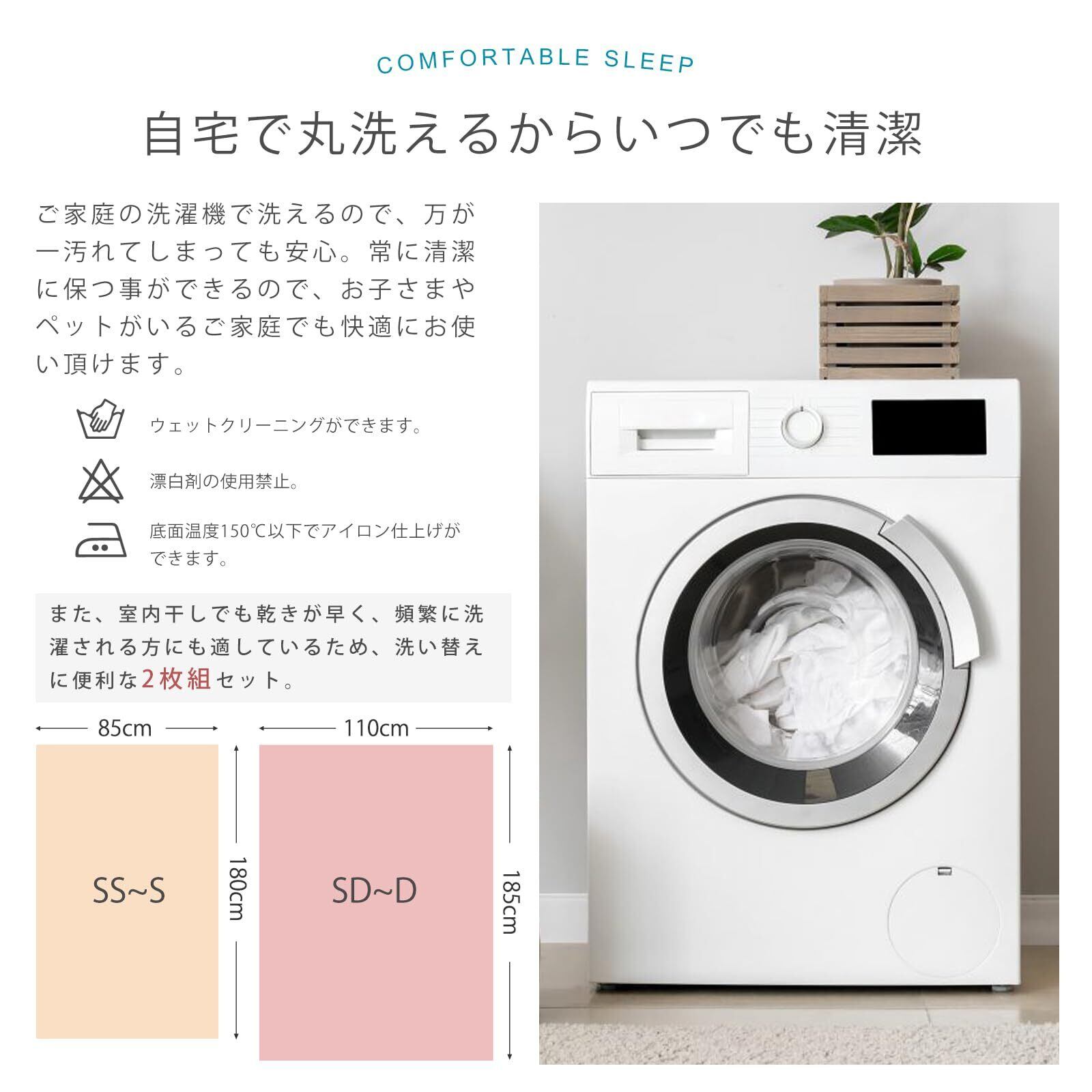 【丸洗い可能・2枚組·オールシーズン対応】シワになりにくく、取り外しや洗濯が簡単です。市販されているほとんどのマットレスに適しています。自宅の洗濯機で丸洗いでき、いつでも清潔に使用できます。また、室内干しでも乾きが早く、頻繁に洗濯される方にも適しているため、洗い替えに便利な2枚組セット。保湿性が高かく静電気が起きづらいことで、どんな季節でも快適な寝心地になります。