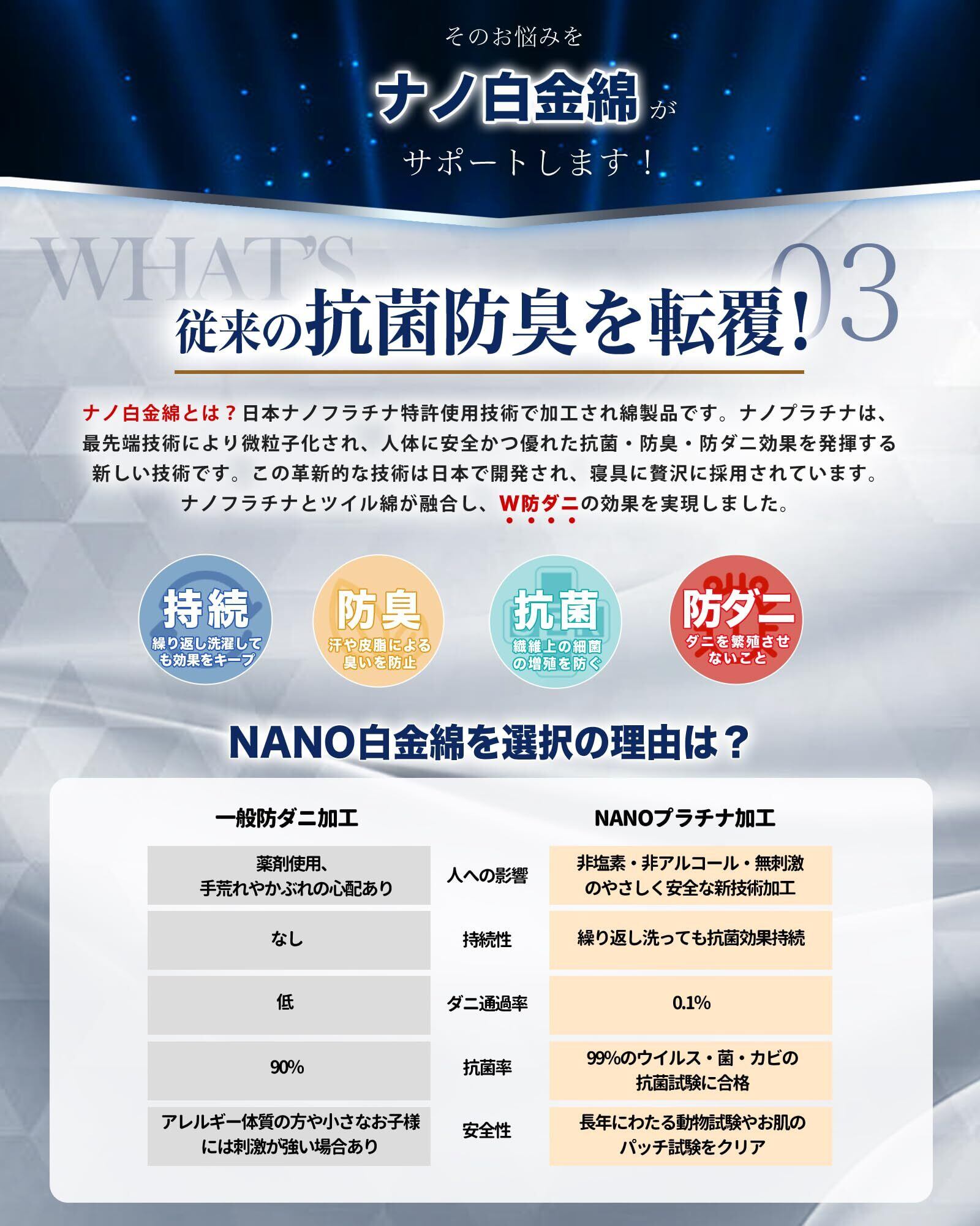 【日本ナノフラチナ使用技術】抗菌・防臭・防ダニ機能を最大限に発揮!ナノプラチナは、最先端技術により微粒子化し、優れた抗菌·防臭·防ダ二効用を発揮する新しい技術です。日本で生まれたこの革新的な技術をベットカバーに贅沢に採用することで、より長時間の清潔効用を持続させ、繰り返し洗濯しても機能を持続いたします。空気中に漂う菌から部屋干し時の濡れたベットシーツを守ります。シーツカバーは湿気の影響を受けやすく、ダニが生息しやすい寝具であるため、ナノフラチナ技術によりダニ対策を強化した設計で、睡眠中も防ダ二対策を徹底しましょう。