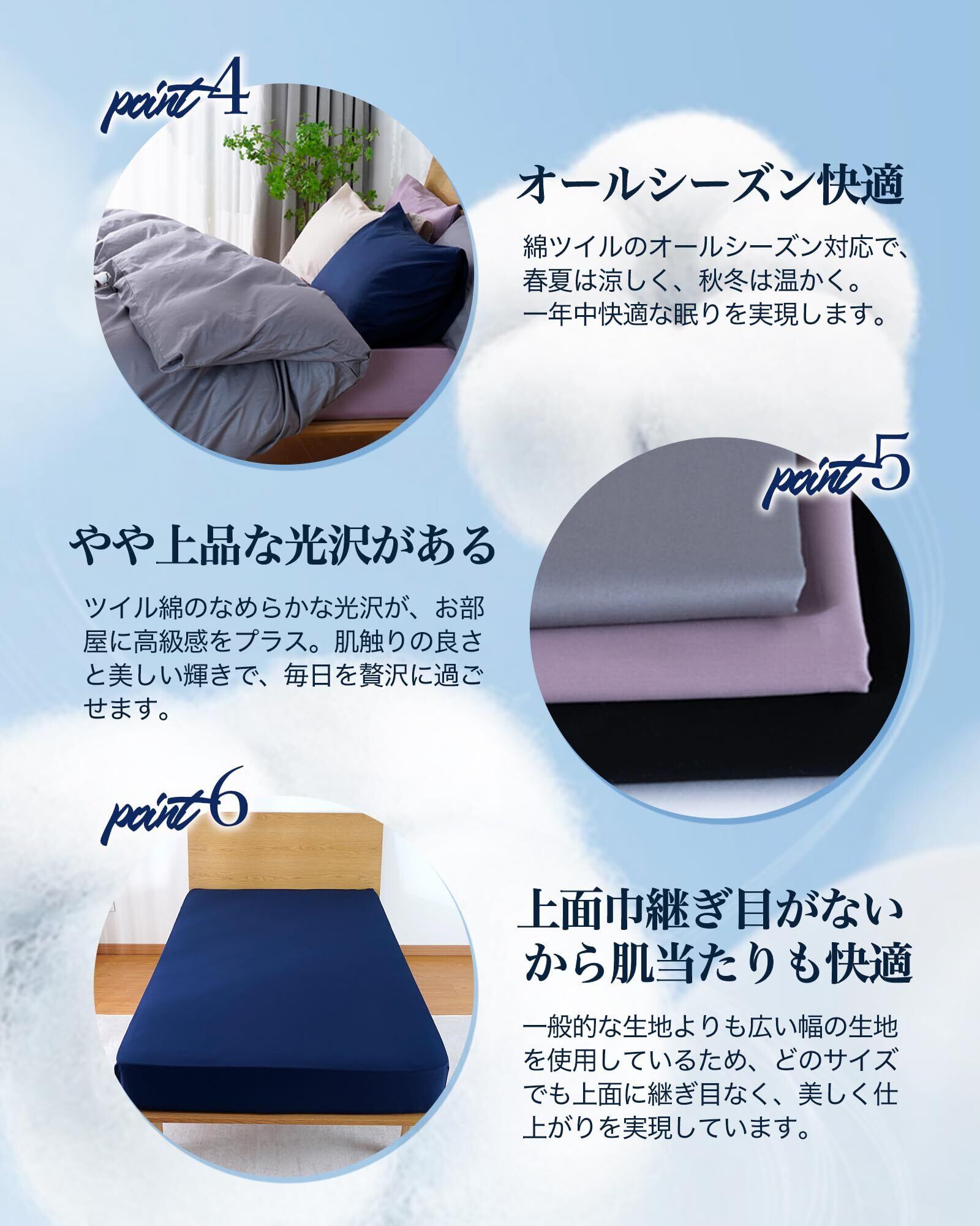 【ホテル仕様の贅沢高密度ツイル織り】耐久性と防ダニ性能を両立ベッドシーツは毎日使うものだから、「通気性がよくて、丈夫でお洗濯による生地の縮みに強い」が絶対条件です。230本の高密度なツイル織りが施されたマットレスカバーは、しっかりとした質感と耐久性を備えています。目が詰まっているため、生地の隙間からのダニの侵入を防ぎます。さらに、ダニだけでなく、ホコリも入りにくいので、ハウスダスト防止にもなります。高級綿コーマ糸で織り上げたベッドカバーは、毛玉ができにくく、上品でやや光沢のある、高級感溢れる新生活のスタートとなる一枚です。いつもの寝室をハイクラスホテルのように演出します。