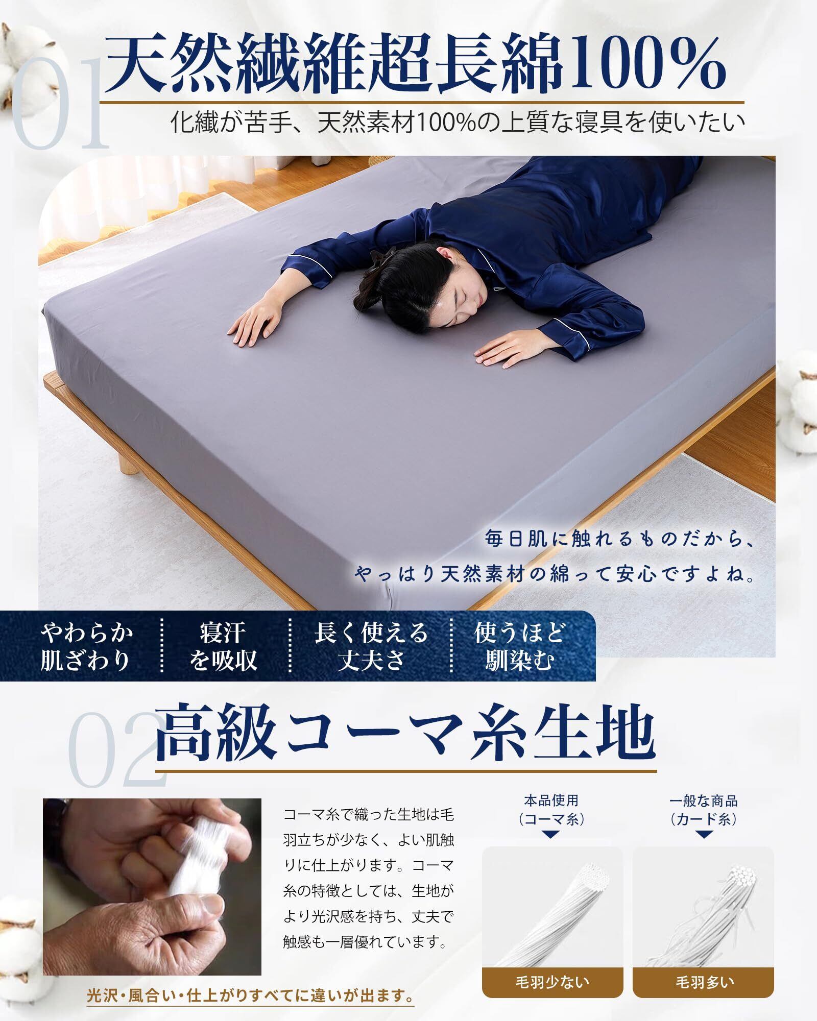 【高級超長綿100%使用・ボックスシーツ シングル 綿100】コットンの繊維の長さにより、短・中・長繊維綿と分類されています。長さが平均35㎜以上の特に長いものを「超長綿」と呼びます。超長綿でさらに加工し、毛玉の原因となる余分な部分を取り除き、毛羽立ちが少なくに仕上がった高級「コーマ」糸になります。上質なコットン100%天然素材であるコーマ糸で織られたボックスシーツは、めん素材ならではの吸湿性、通気性に優れ、一年中サラッと快適に過せます。また、静電気が発生しにくく、ポリエステル混紡では味わえない天然素材の柔らかさと肌触りを提供します。さらに、抗菌防臭性に優れたプラチナ(白金)を組み合わせることで、抗菌・防臭機能も持続します。洗濯を重ねるほどに柔らかくなり、肌に馴染む使い心地が特徴です。