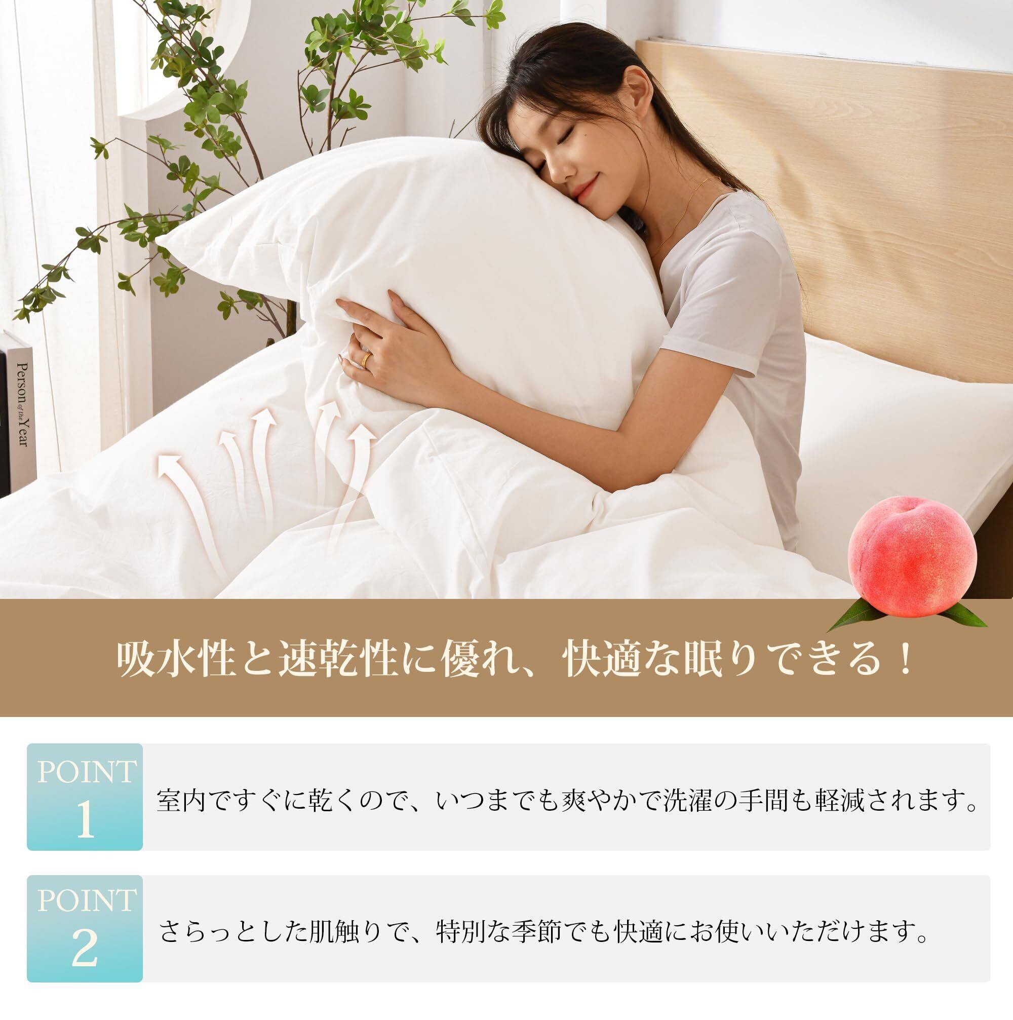 【優れた通気性 速乾性】通気性、吸湿性、発散性に優れており、汗をかきやすい暑い夏でも肌をサラサラに保ち、湿気による細菌などの繁殖を抑えます。冬の時、カバーの繊維と繊維の間に暖かな空気をためてくれるので、保温性が高く、暖かな状態を保ってくれます。季節を問わず長くお使いいただけます。