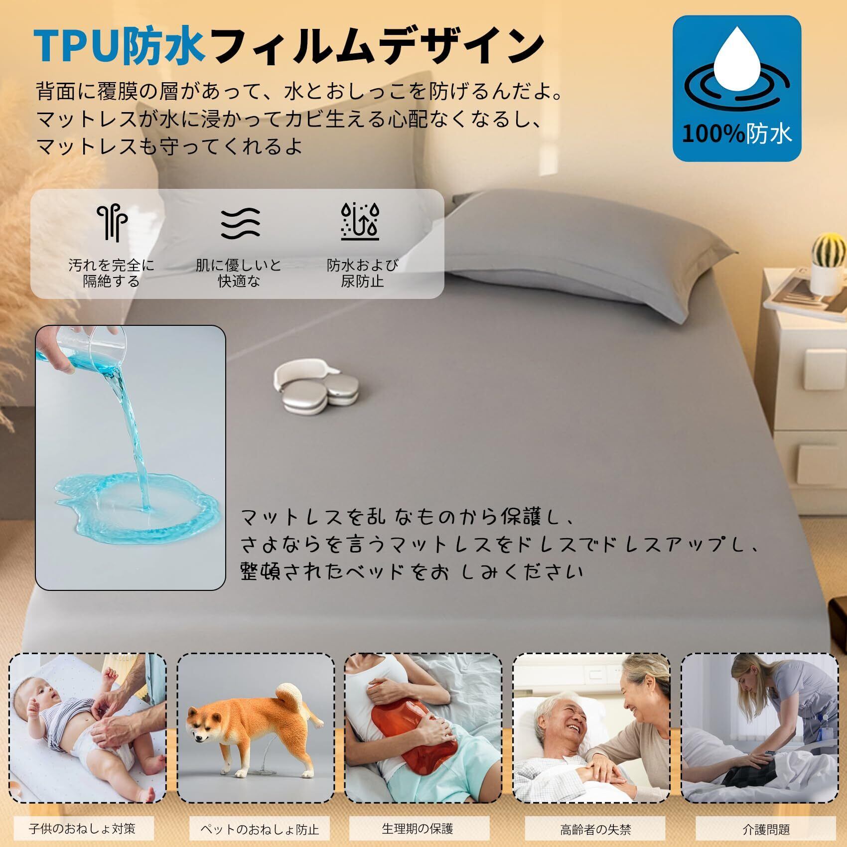 【五面防水設計&圧倒的な防水性】:裏面には通気性の高いTPU防水膜を採用し、通常の防水膜よりも通気性が高く、粘りも強くなる。従来品に比べて、五面防水設計を採用し、ベッド表面だけでなく側面部分も防水仕様なので、カバーエリアが広がります。防水性を高めて、汗・水などをかけでも、マットレスに水分は到達しません,お子様のおねしょやペットのそそう、高齢者・病人などの介護用寝具を汚してしまう心配を軽減し、清潔・衛生的に保ち、心地よい眠りをサポート。