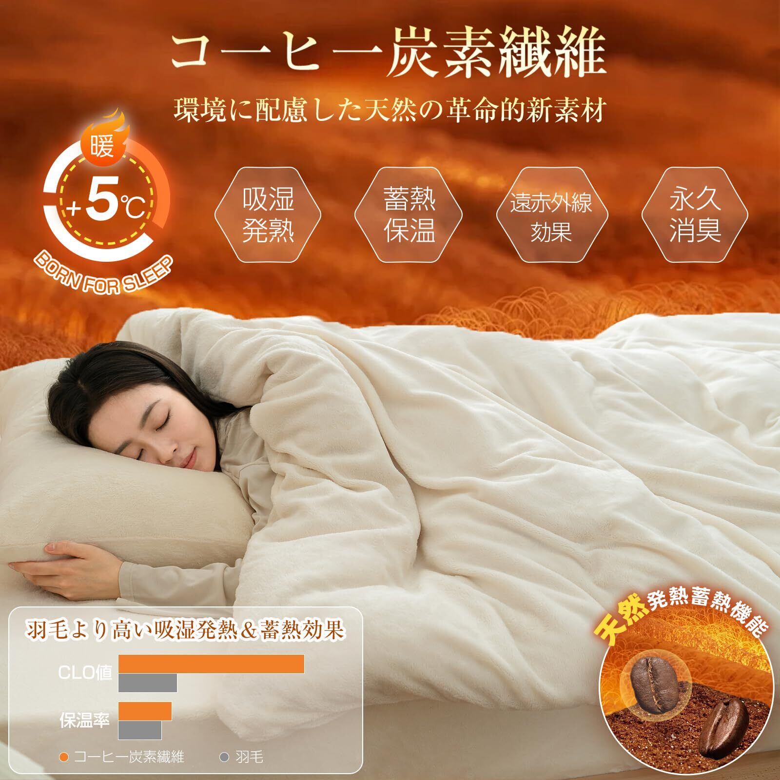 【プラス5℃蓄熱保温】天然発熱素材のコ一ヒ一炭素纎維をフランネル地に練り込み、格段に暖かさを保ってくれます。細かい繊維の隙間にたっぷり空気を含むので、身体の熱を保持します。体から放出される遠赤外線を素早く吸収して再放出するため暖かさが体を包み込みます。布団に入った瞬間、ふわふわぽかぽかな暖かさに包まれます。