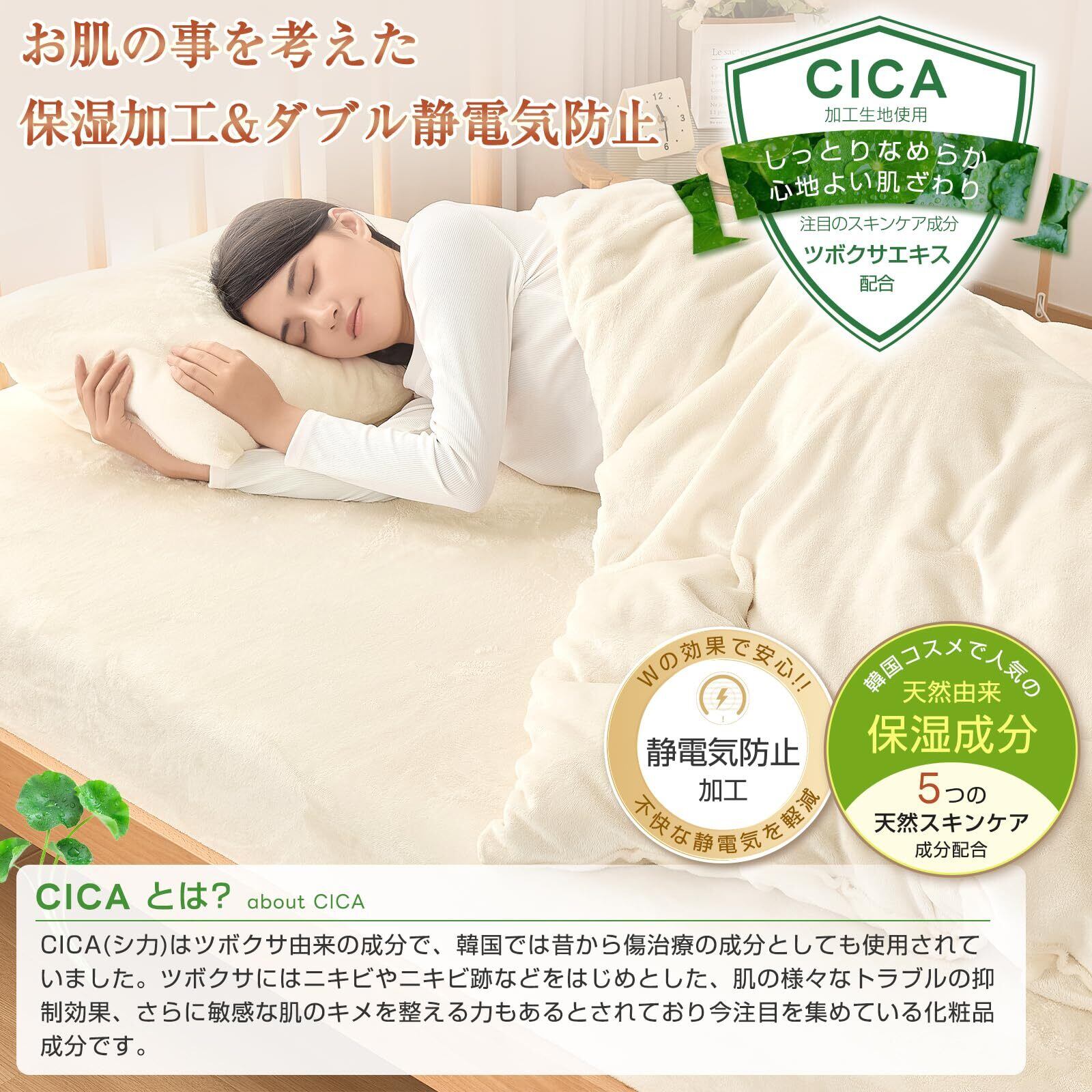 【CICA保湿成分コーティング】コスメ業界で話題のCICA(ツボクサエキス)成分を布団カバーの生地にも採用。静電気を軽減させ、ホコリや花粉等が付きにくくなっています。天然保湿成分で従来の防電気薬剤加工より長く持続します。生地の柔らかさも引き立たせ、肌の保湿・肌荒れ防止にも役立ちます。