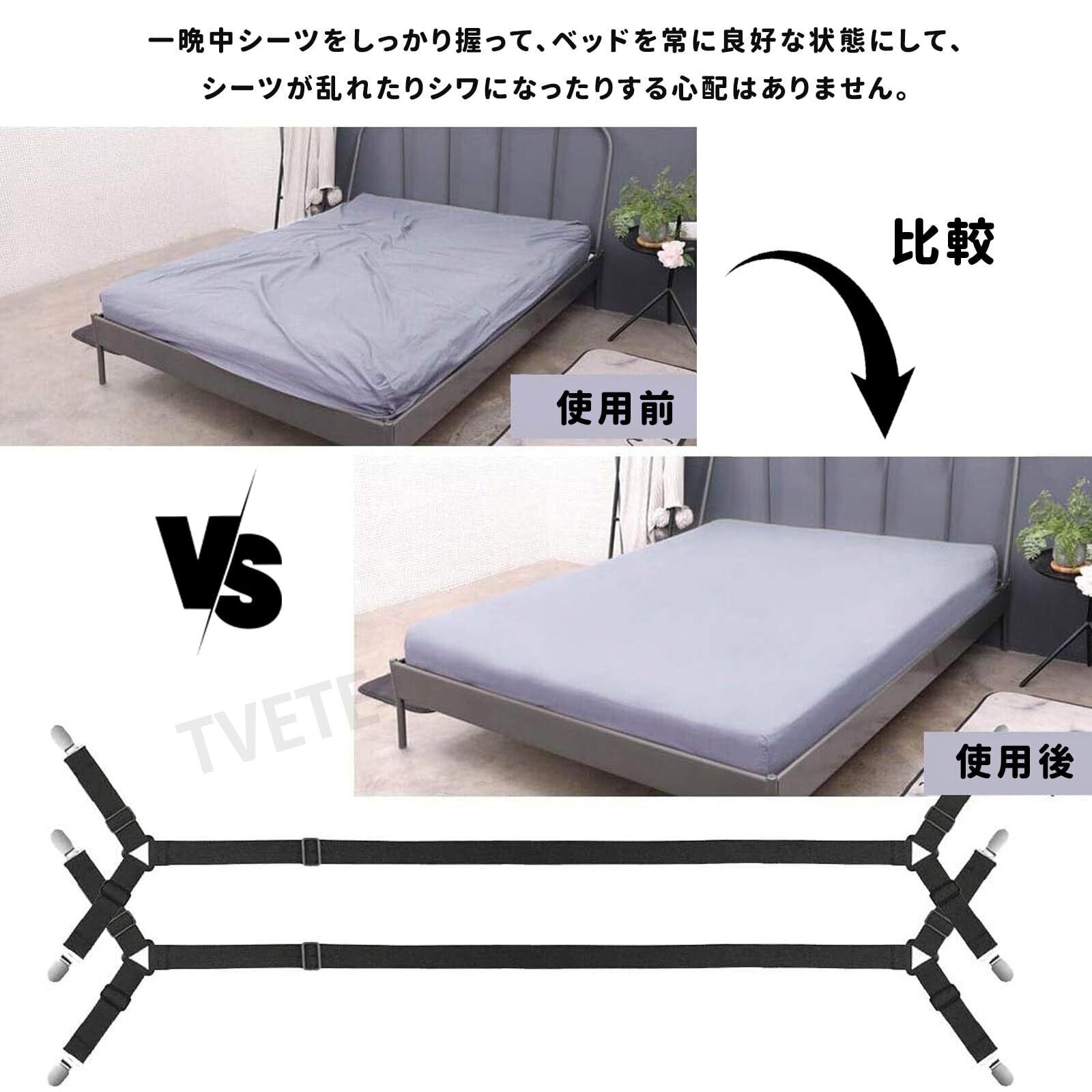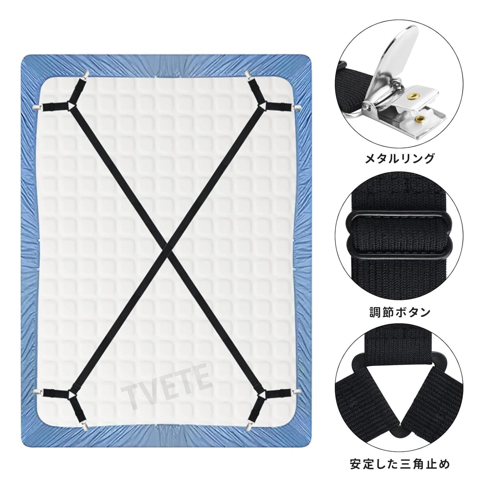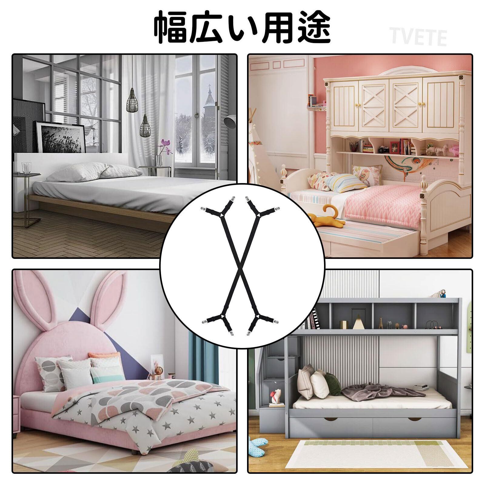 TVETE マットレス ズレ防止 ベルト ベッドシーツクリップ 黒 ボックスシーツ 留め具 布団カバー【 2本入 】 布団クリップ 伸縮 280cm 伸縮 固定 滑り止め 布団 ずれ ベッドカバー 固定 グッズ 強力ずれ シングル/ダブル/クイーン/ソファー用