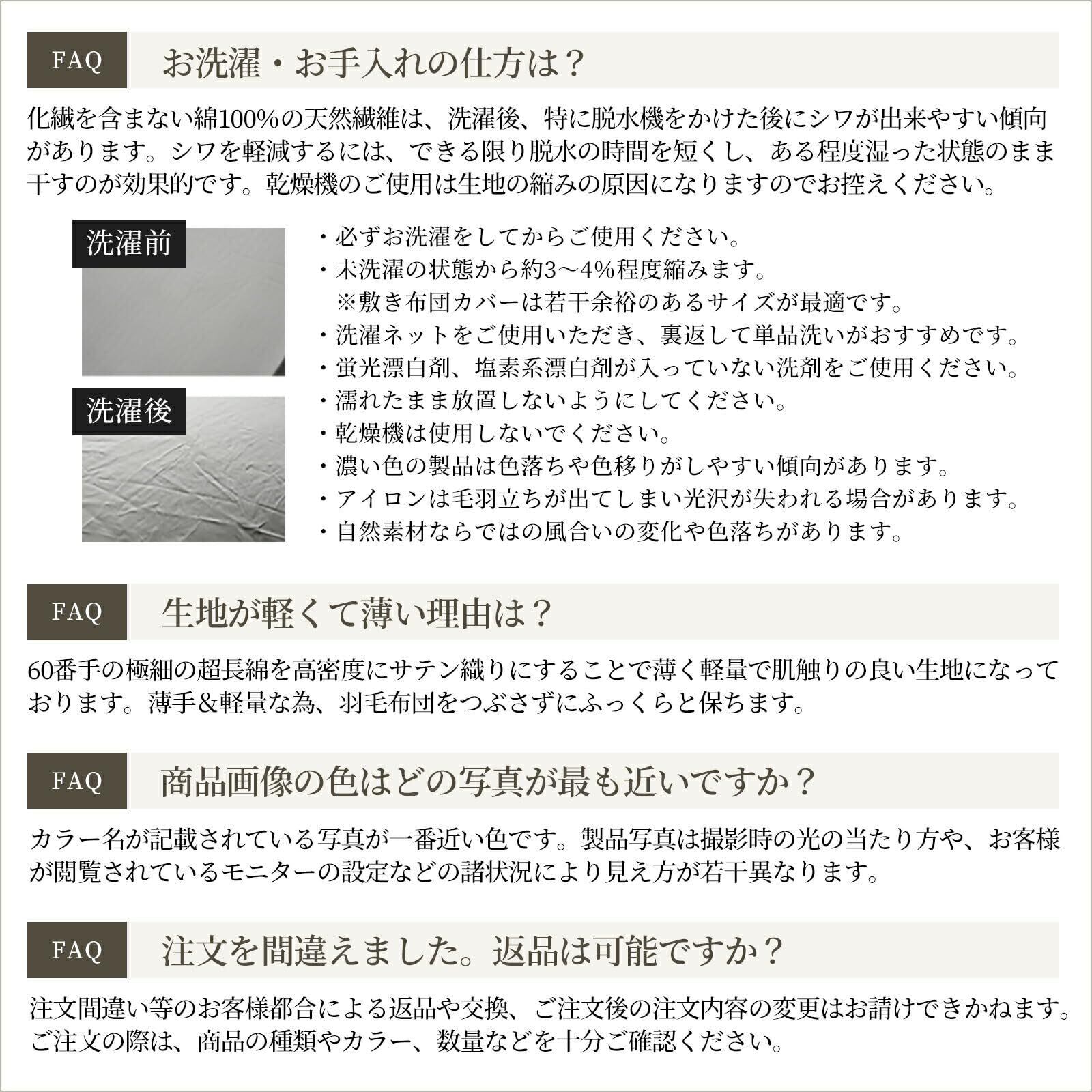 【素材】 綿100% 【生産国】 日本(併設された自社工場で生産しております。)摘み取った天然コットンの中でも特別に長い平均35mm以上の超長綿を使用しており 60番の細番手糸を高密度でストライプ柄に織り上げた生地(サテンストライプ)は、しなやかさと滑らかさ、そして品の良い艶や光沢があり、防ダニ仕様、軽量で つるつるした手触りは感動ものです。寝室を高級ホテルのように演出します。国内縫製だから、丈夫で上質、高品質。羽毛布団、羽根布団にも最適、カラーも豊富にご用意しております。