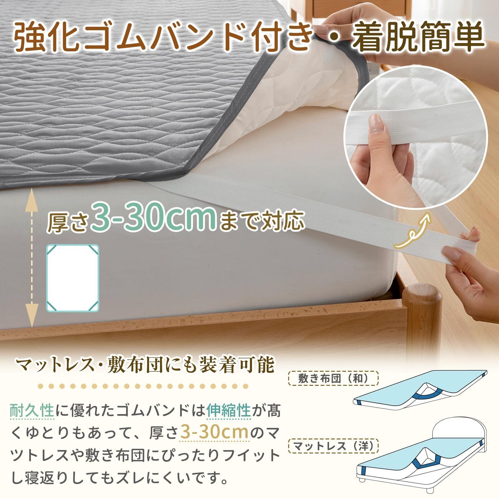 【着脱簡単・ズレにくい】敷き布団でもマットレスでも使える四隅にゴムパンド付きで、寝返りでもズレにくくお洗濯の際の着脱も簡単です。マットレスの厚さは20cmまで対応、200cm丈の敷き布団でもお使いいただけます。