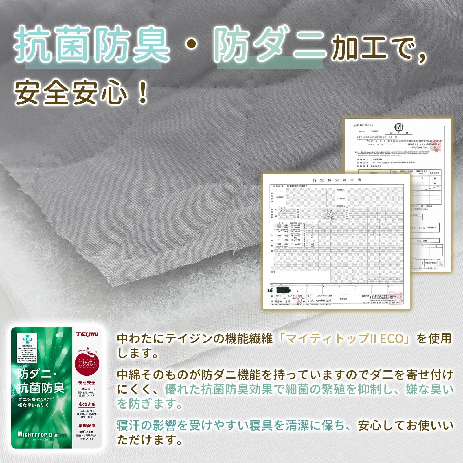 【抗菌防臭・防ダニ中綿使用】マイティトップⅡ中綿を使用し、SEK認証された優れた抗菌防臭効果で、細菌の繁殖を防ぐ抗菌・いやなに臭いを抑えます。通常の繊維と比べて、洗濯耐久性を実現しています。オールシーズンずっと心地よくお休みいただける品質にもこだわりました。