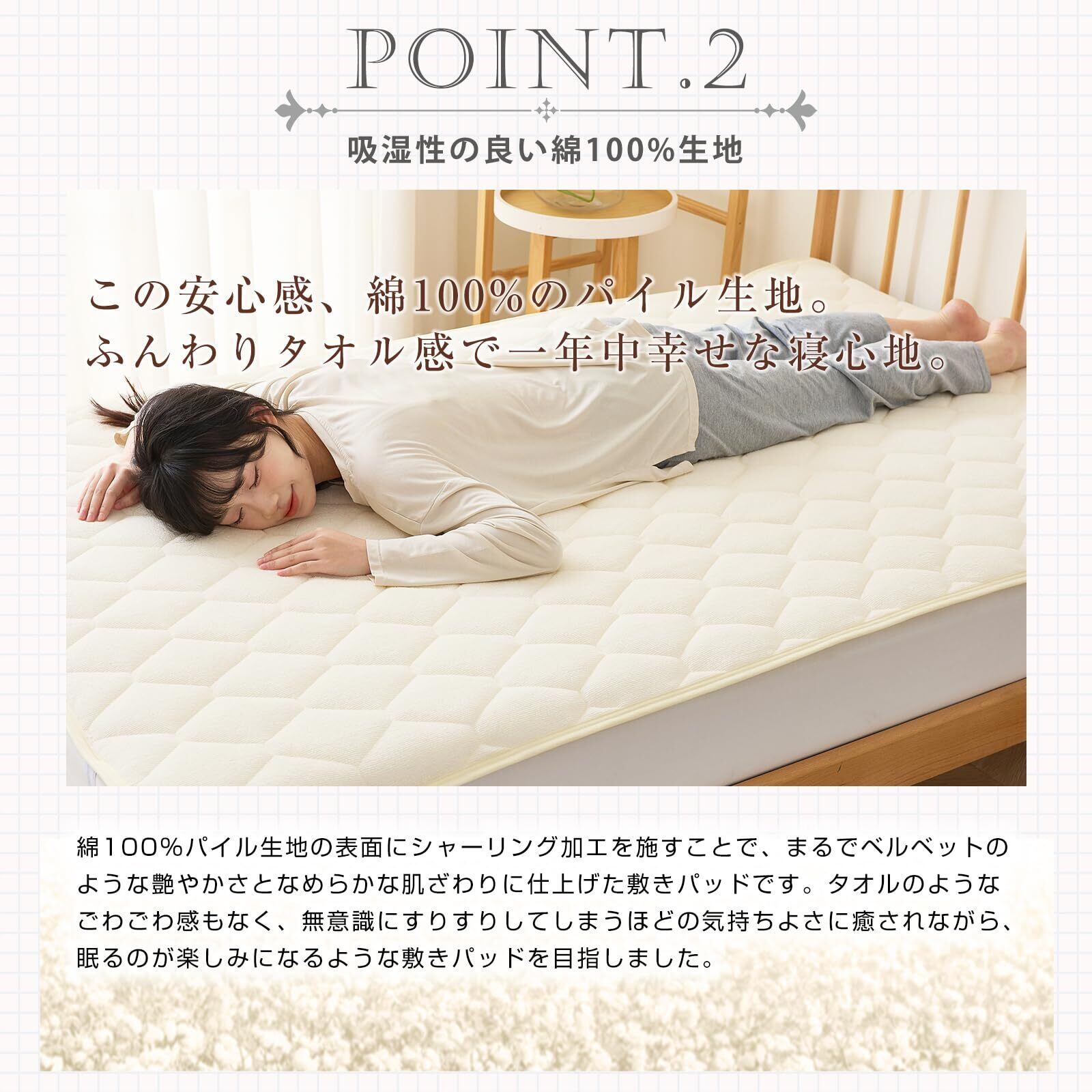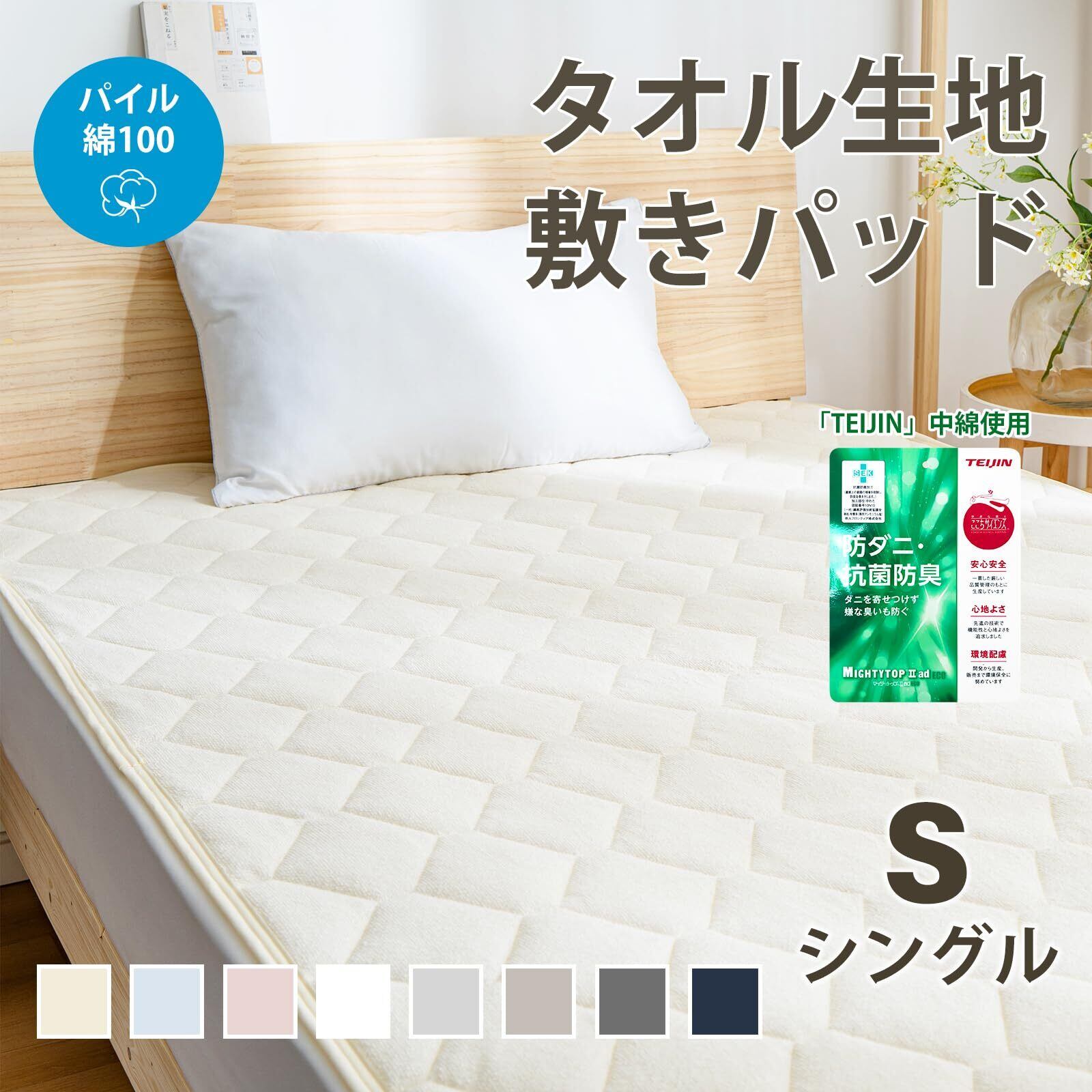 【吸湿性抜群の綿100%パイル】サイズ:シングル・100x200cm;表側パイル部分:綿100%;表側グランド部分:ポリエステル100%;中綿:ポリエステル・抗菌防臭帝人(TEIJIN)綿含み。仕様:四隅ゴムバンド付き。敷きパッドのお肌に直接触れるパイル部分に吸湿性抜群の天然素材の綿100%を使用し、湿気や汗を吸収でき、寝心地快適、春・夏・秋・冬を通してお使いいただけます。