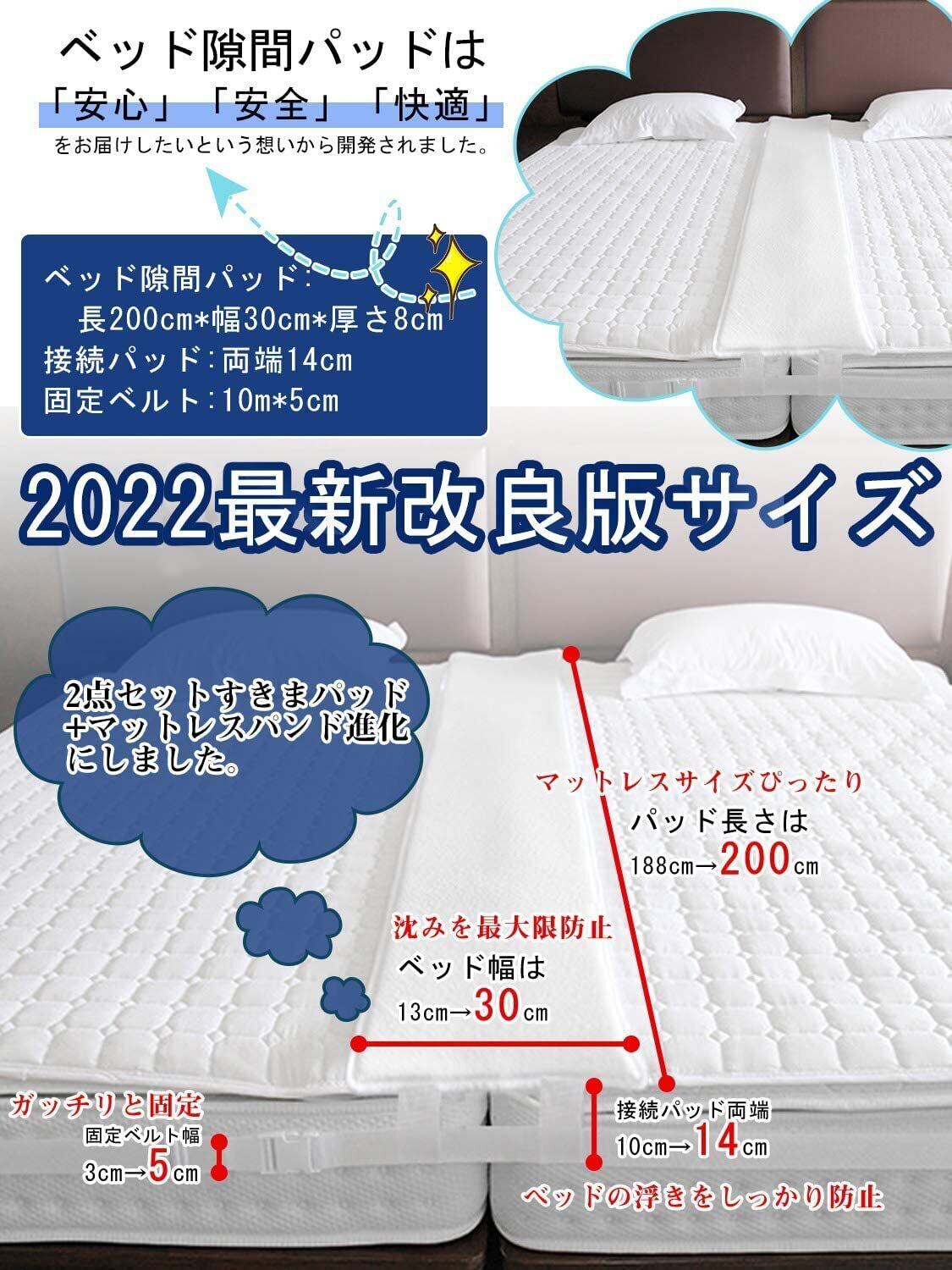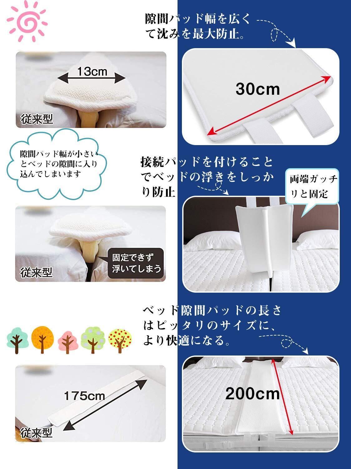 【ワイド幅30cm & 2つ接続ベルト】隙間パッドが隙間に埋まらないように、この隙間パッドの落下防止帯を一つから二つに改良しました。それに、収納袋付き、もっと便利になっています。マットレス固定バンドも3cmから5cmに改良します。3段の溝がベッドからのずれを防ぎます。