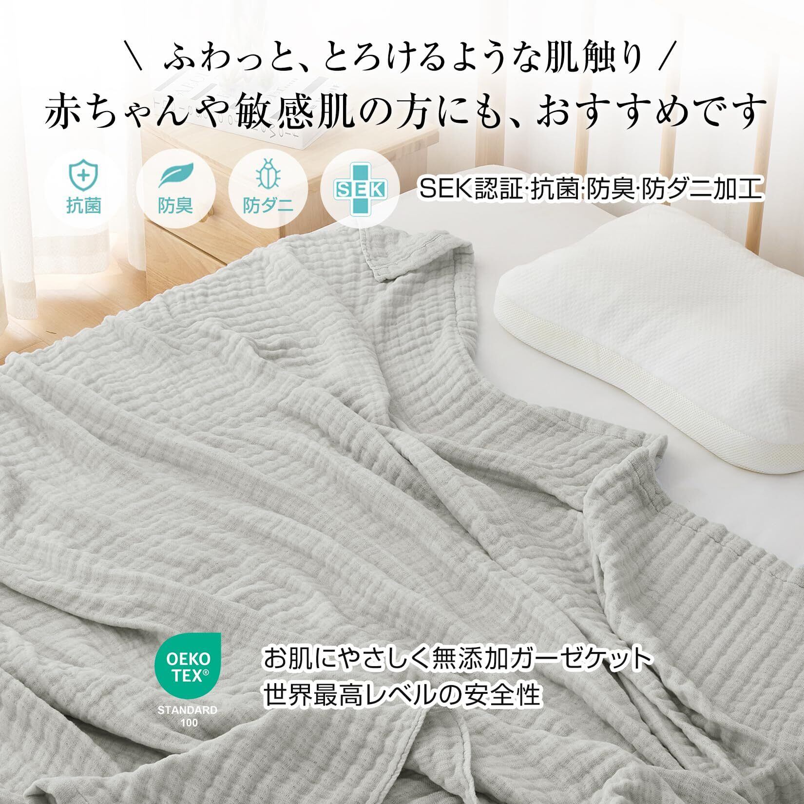 【6重ガーゼ構造】ふんわりでやわらか、肌かけ・肌触りもやさしく、軽い掛け心地になり、エアコンによる寝冷え対策にもぴったりです。