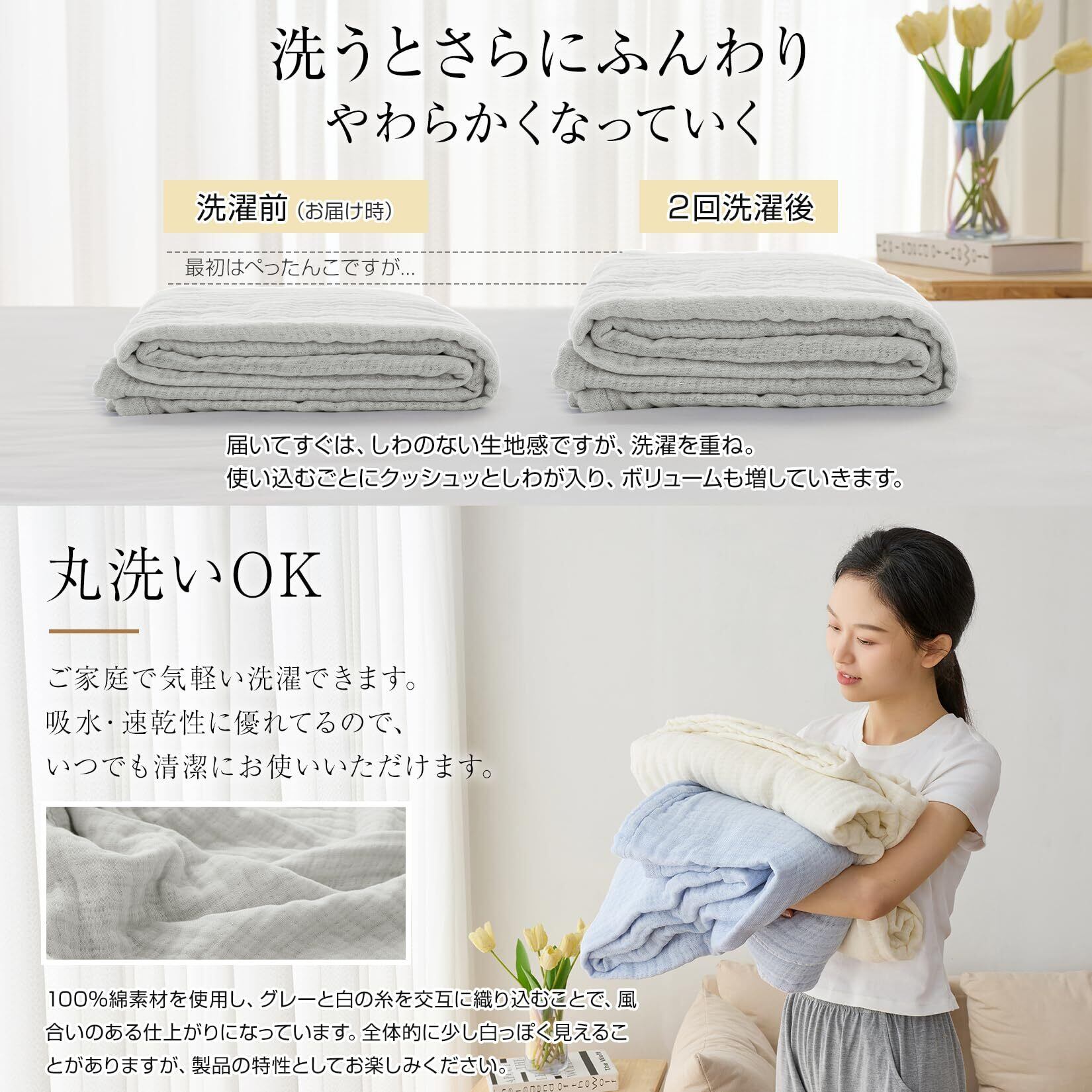 【丸洗いOK】ご家庭での洗濯はもちろん、洗うたびにどんどん柔らかくなり、いつでも包まっていたくなる肌触りです。洗濯機の弱水流でネットで洗ってください。ガーゼ素材なので、速乾性に優れて夏日なら半日ほどで乾きます。【商品仕様】「サイズ」シングル·140x190cm ダブル·180x200cm 「素材」天然綿100%(天然コットン100%)【ご注意】万が一商品に不具合(初期不良など)がある場合はお気軽に当店までにご連絡ください。