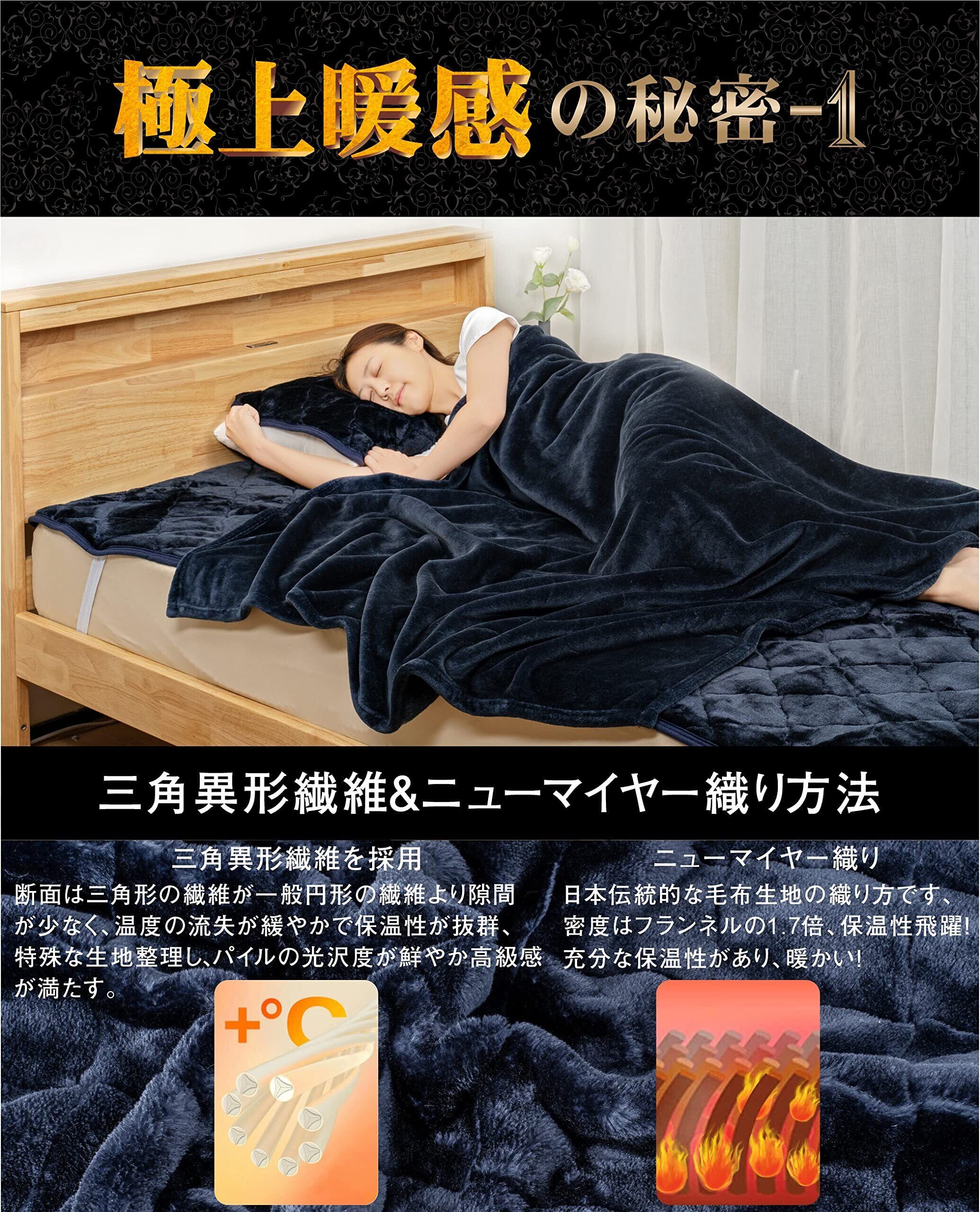 〔日本伝統技法、極上の暖かさの毛布〕一般的に流通された2枚合わせの毛布と比べ、本製品は1枚の毛布に仕上げ、生地を両面共に起毛させたニューマイヤー毛布になります。毛足に空気を多く包み込んでいるため、暖かい空気をしっかりと閉じ込め、蓄熱保温性に優れているのが特徴です。さらに軽量でご使用時の圧迫感を感じにくく、快適にご使用いいただけます。