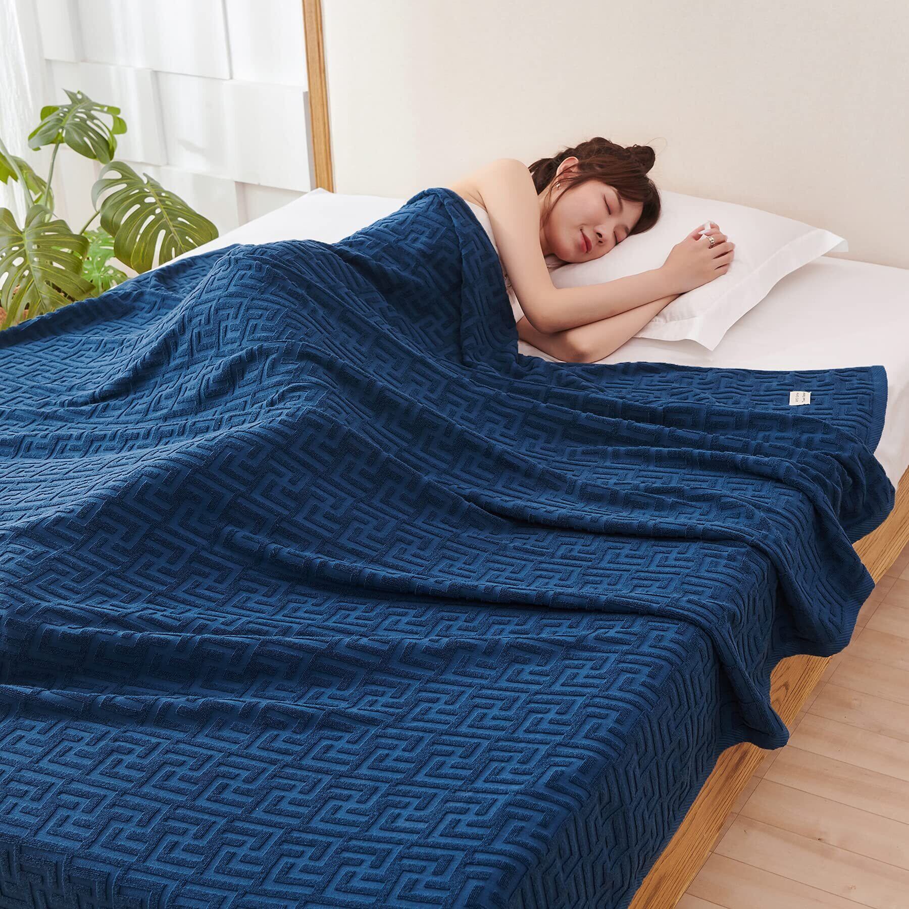 AYO タオルケット シングル ブランケット 綿100% コットン おしゃれ エアーケット キルトケット 抗菌 肌掛け 軽量 柔らかく肌触り 毛玉が出ない 毛布 オールシーズン 夏用 ソファー用 丸洗いOK 吸湿速乾 母の日 父の日 誕生日のプレゼント(ネイビー,140*190cm)