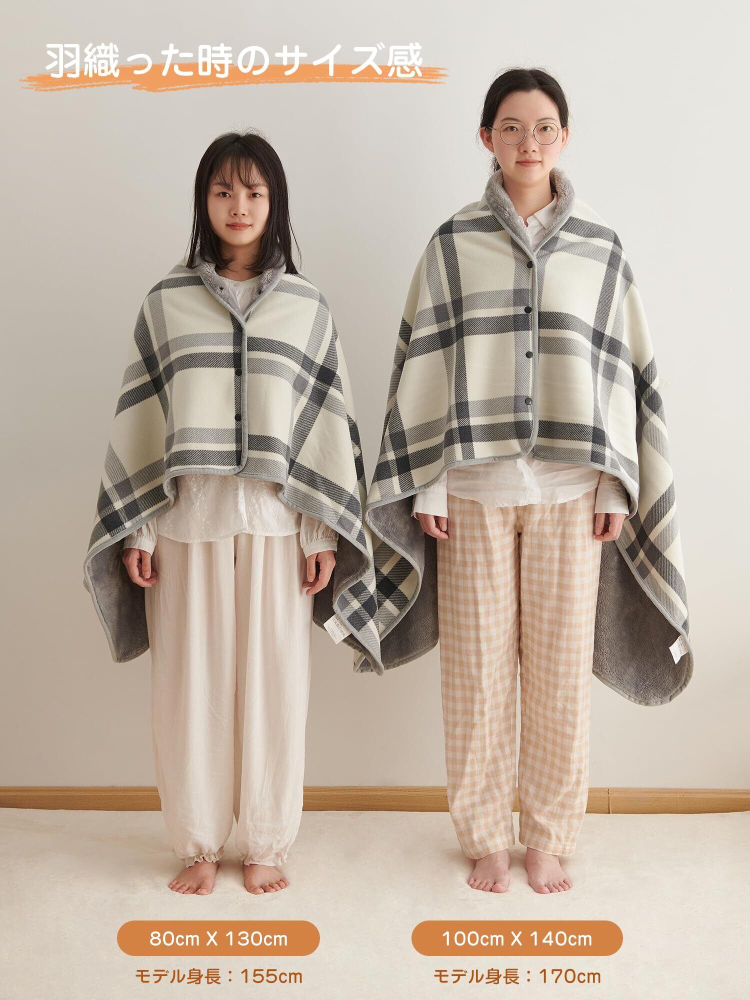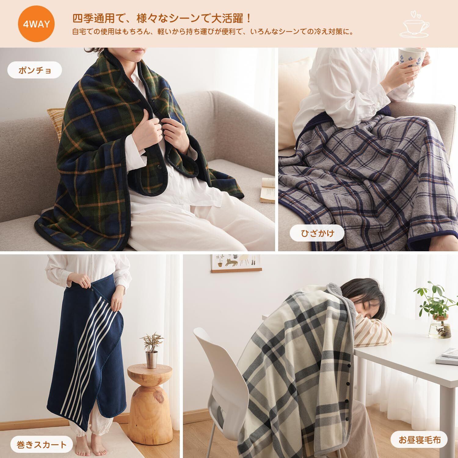 【4way使い方】4組のスナップボタン付きで、滑り落ちる心配なし、自由に着る方を変更できます。使う場合に合わせて、「ポンチョ」「ひざ掛け」「腰巻きスカート」「ブランケット」など様々な使い方ができます。